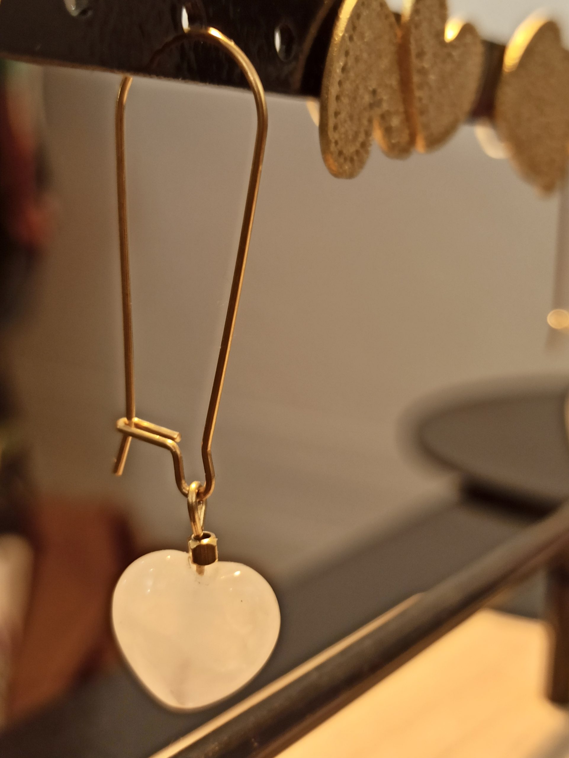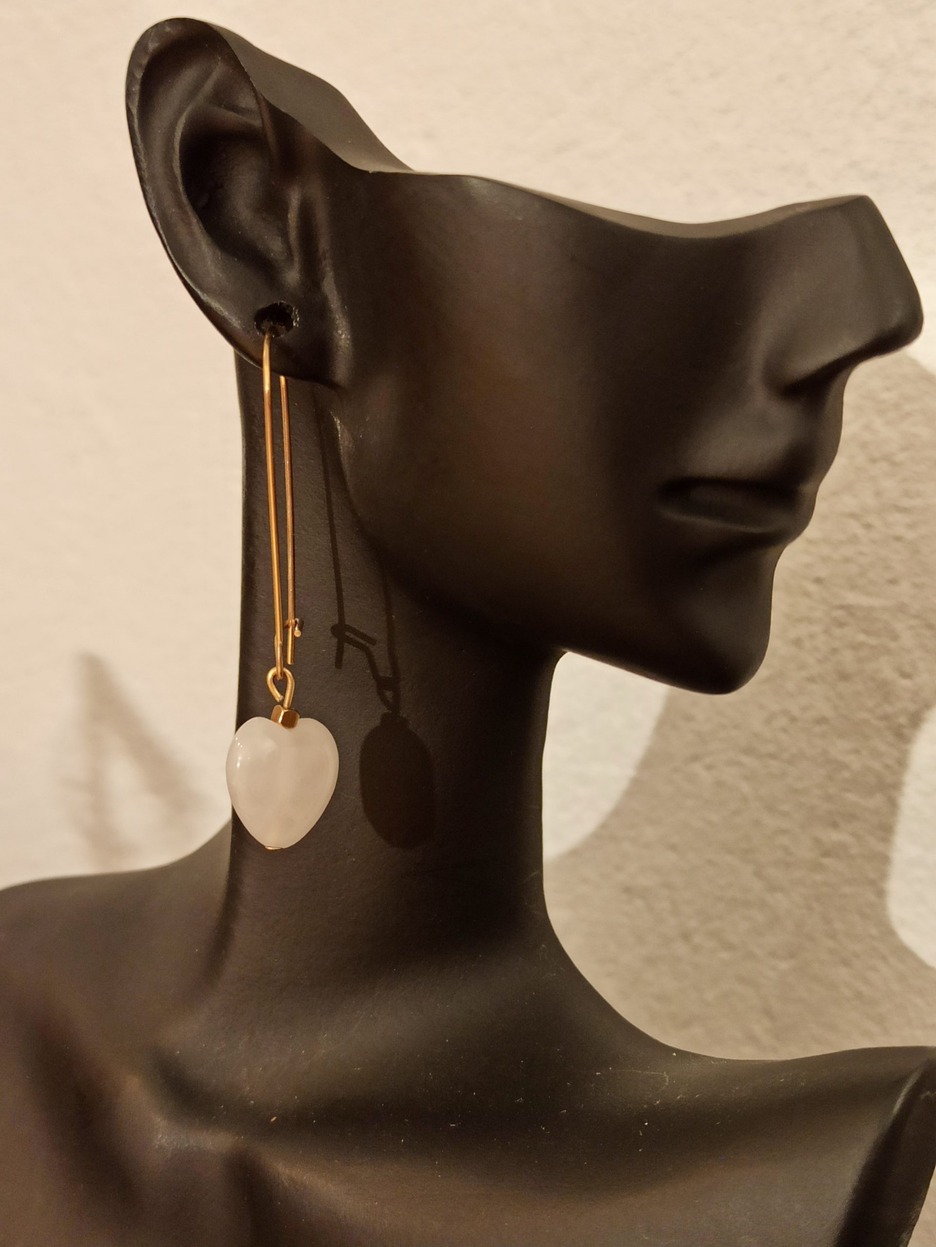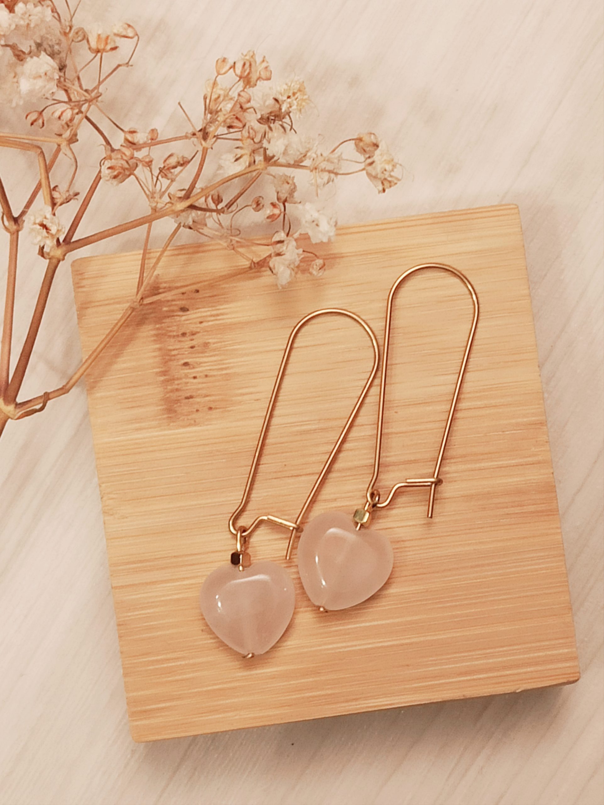 Très jolies paires de pendantes, le coeur est en pierre naturelle d’un rose très pâle.