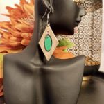 Paire de BO très lĂ©gère en bois de ChĂŞne en forme de losange avec une breloque verte peinte main.Â
