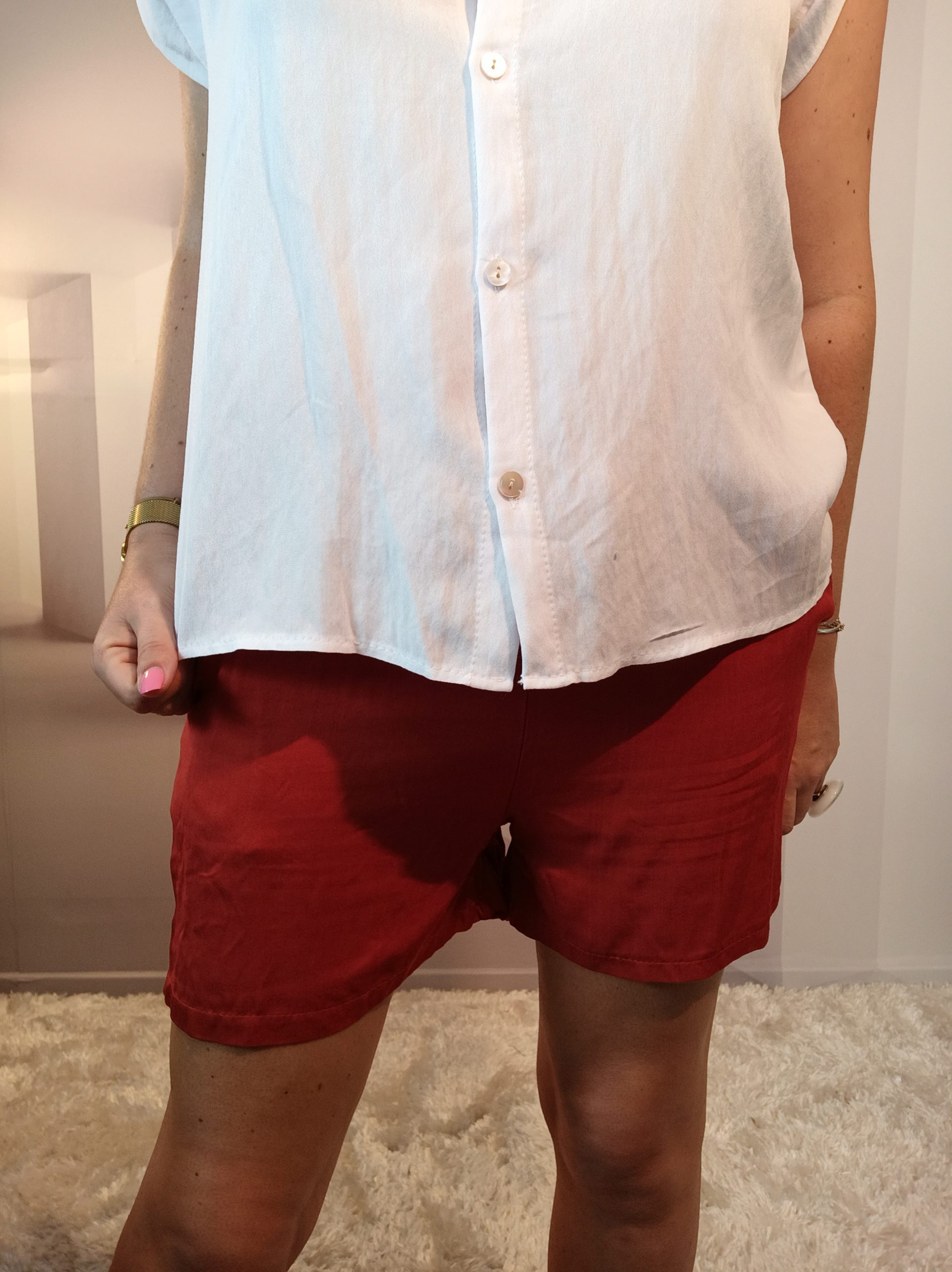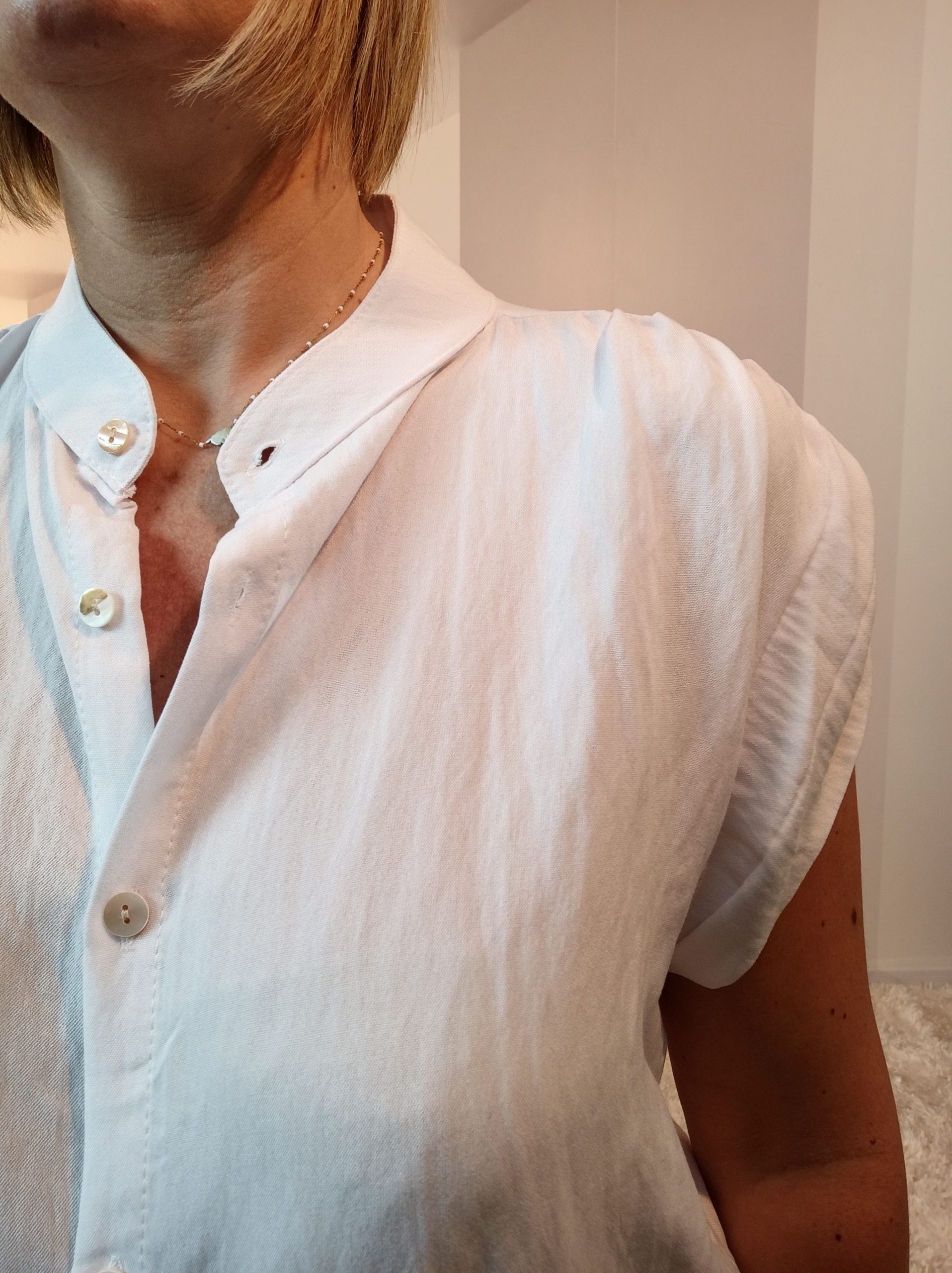 Très jolie chemise col Mao avec revers sur les manches et plis sur les épaules qui lui donne un style casual chic.