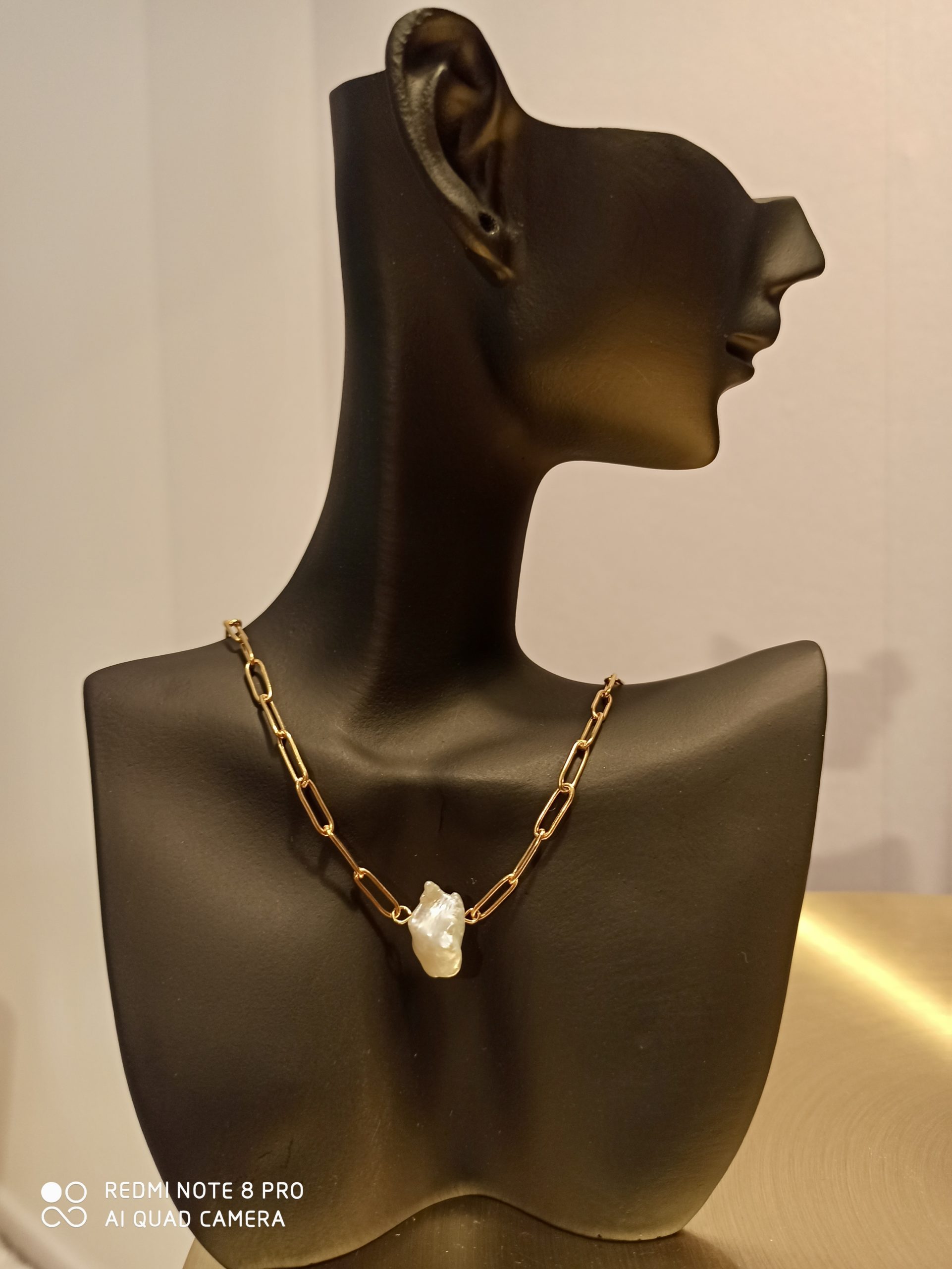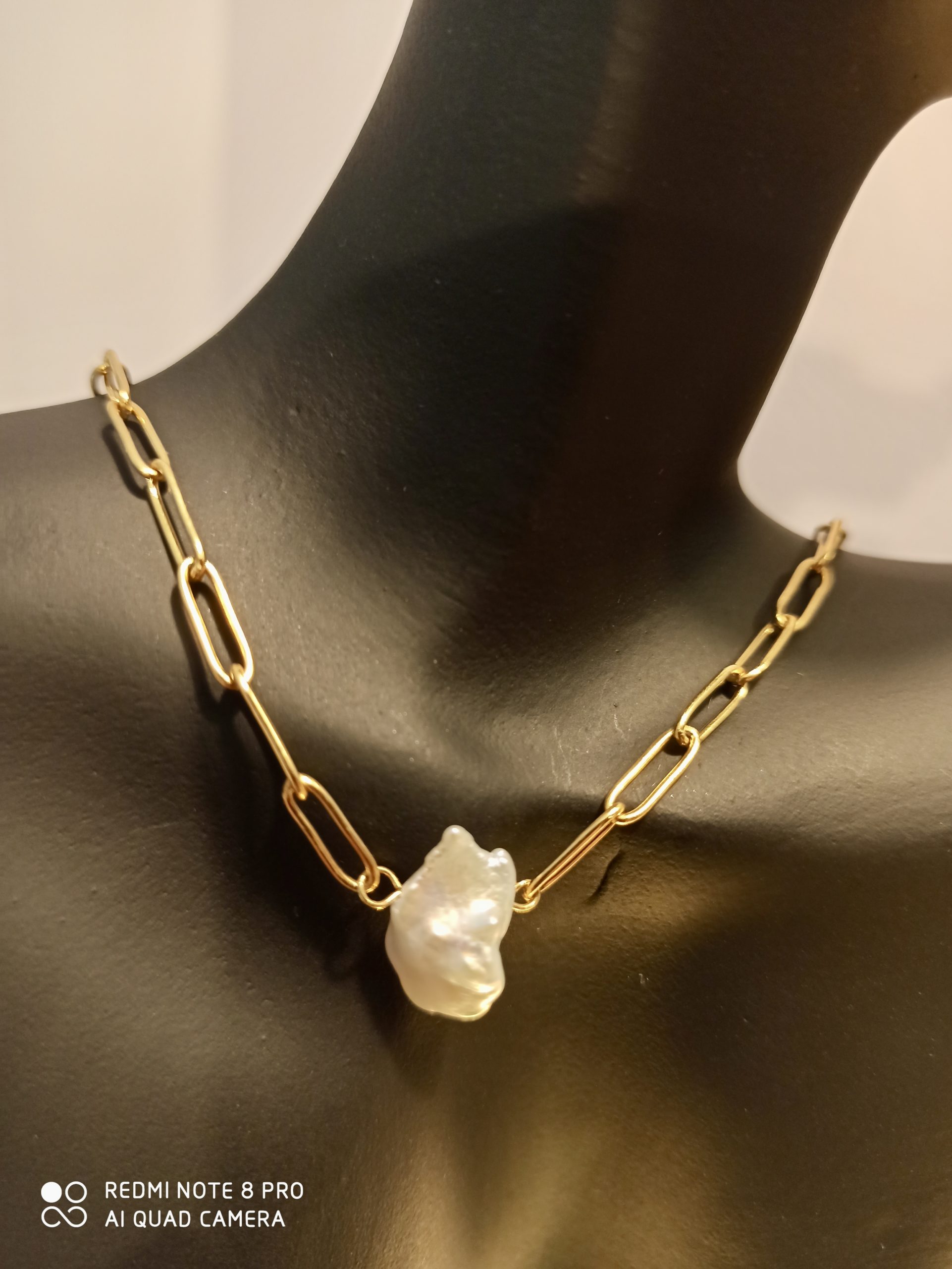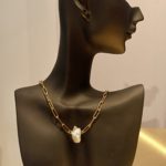Collier en acier inoxydable composé d’une nacre, qui peut se raccourcir grâce à sa maille trombone