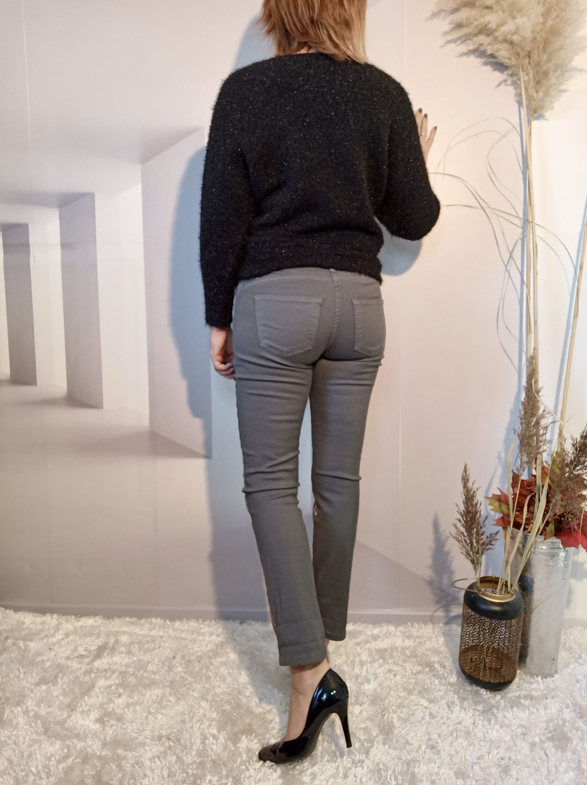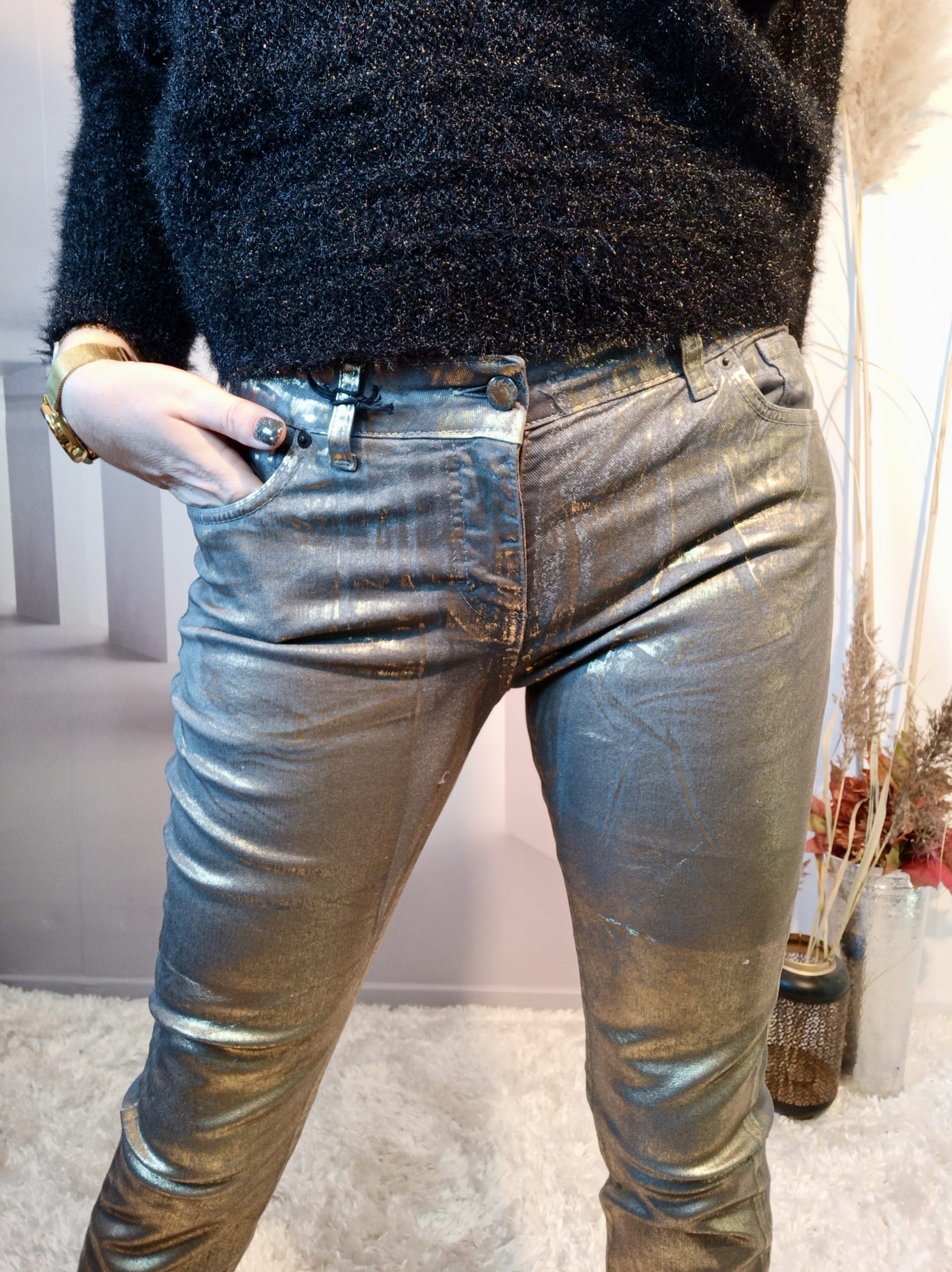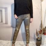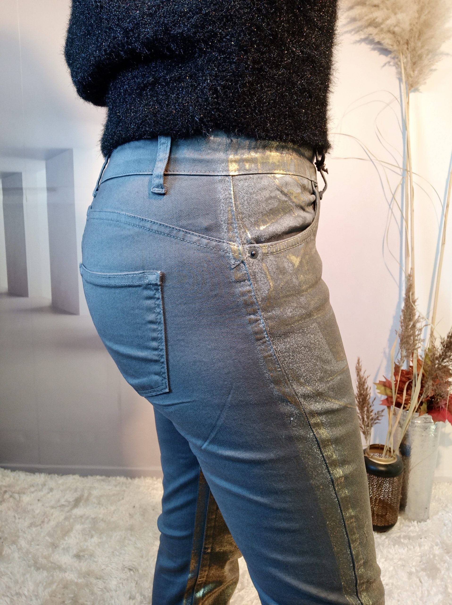 Superbe jean double effet sur fond gris, neutre à l’arrière et doré à l’avant, effet assuré !