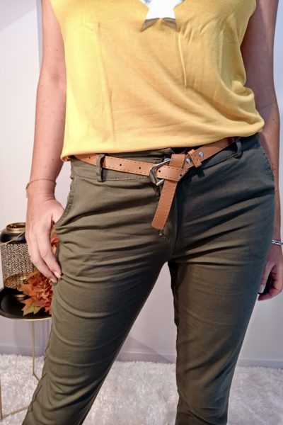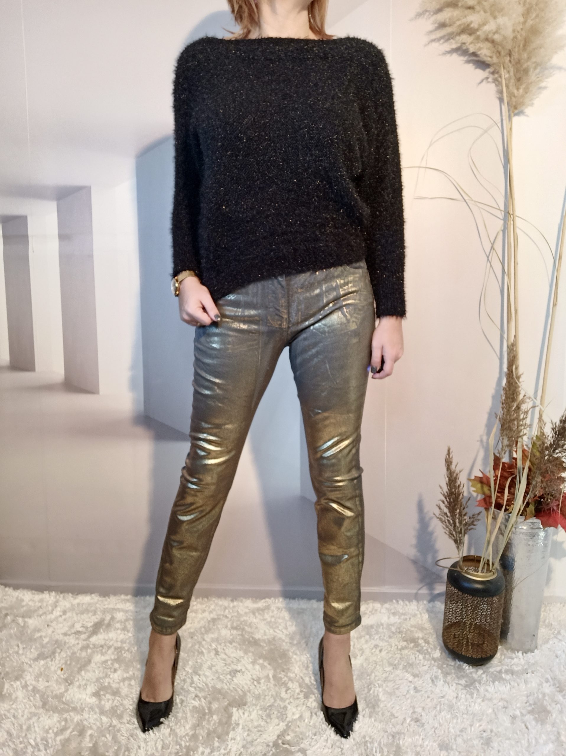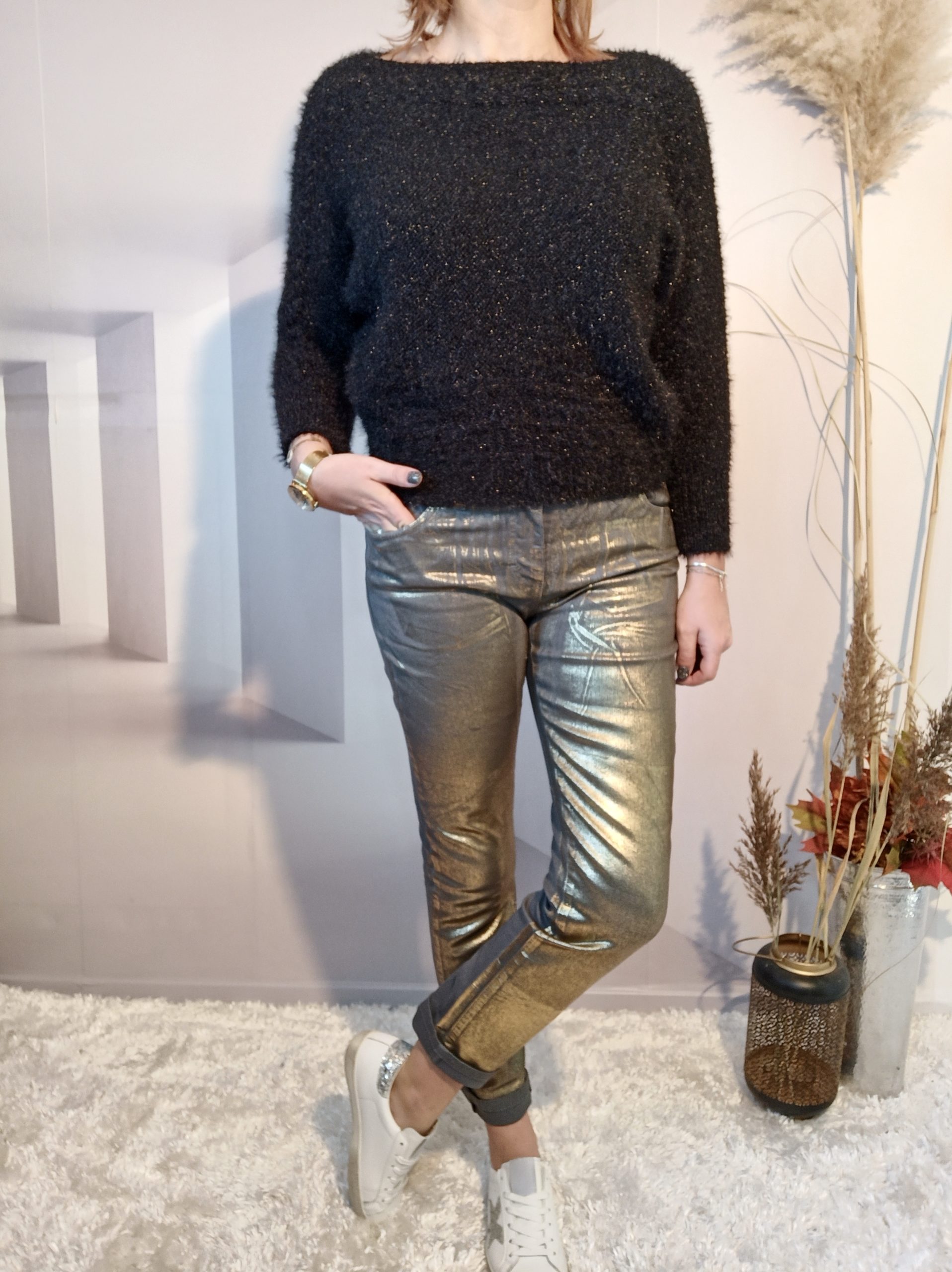 Superbe jean double effet sur fond gris, neutre à l’arrière et doré à l’avant, effet assuré !