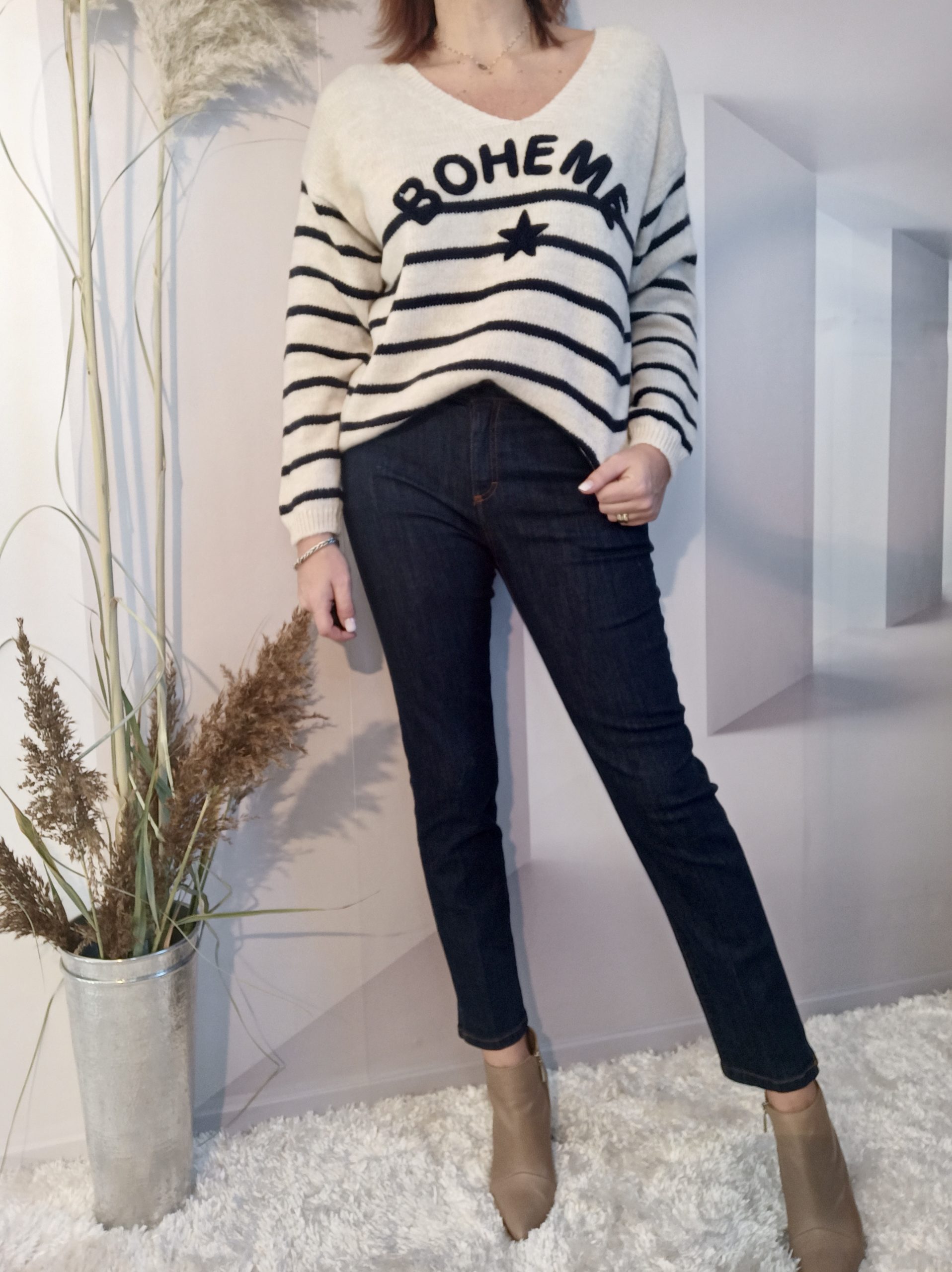 Porté avec le Pull Marinière Bohème et le Débardeur Dentelle Or Ivoire ou les chemises Chemise Longue Bleu et Blanc et Chemise Longue Bleu et Blanc