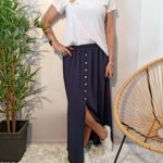 Très jolie jupe fendue au niveau du genoux avec des boutons en coquillages naturels (faux boutonnage).