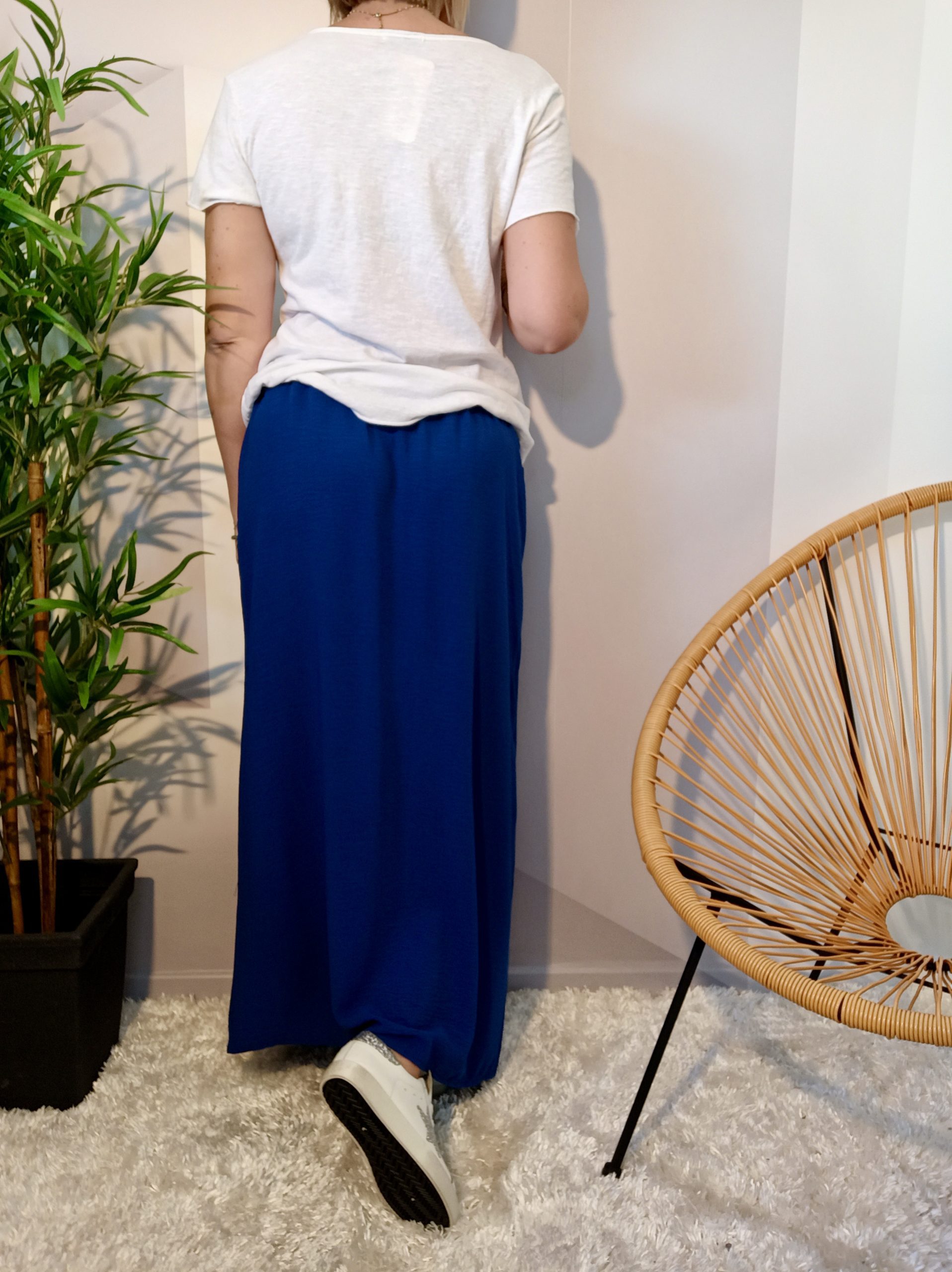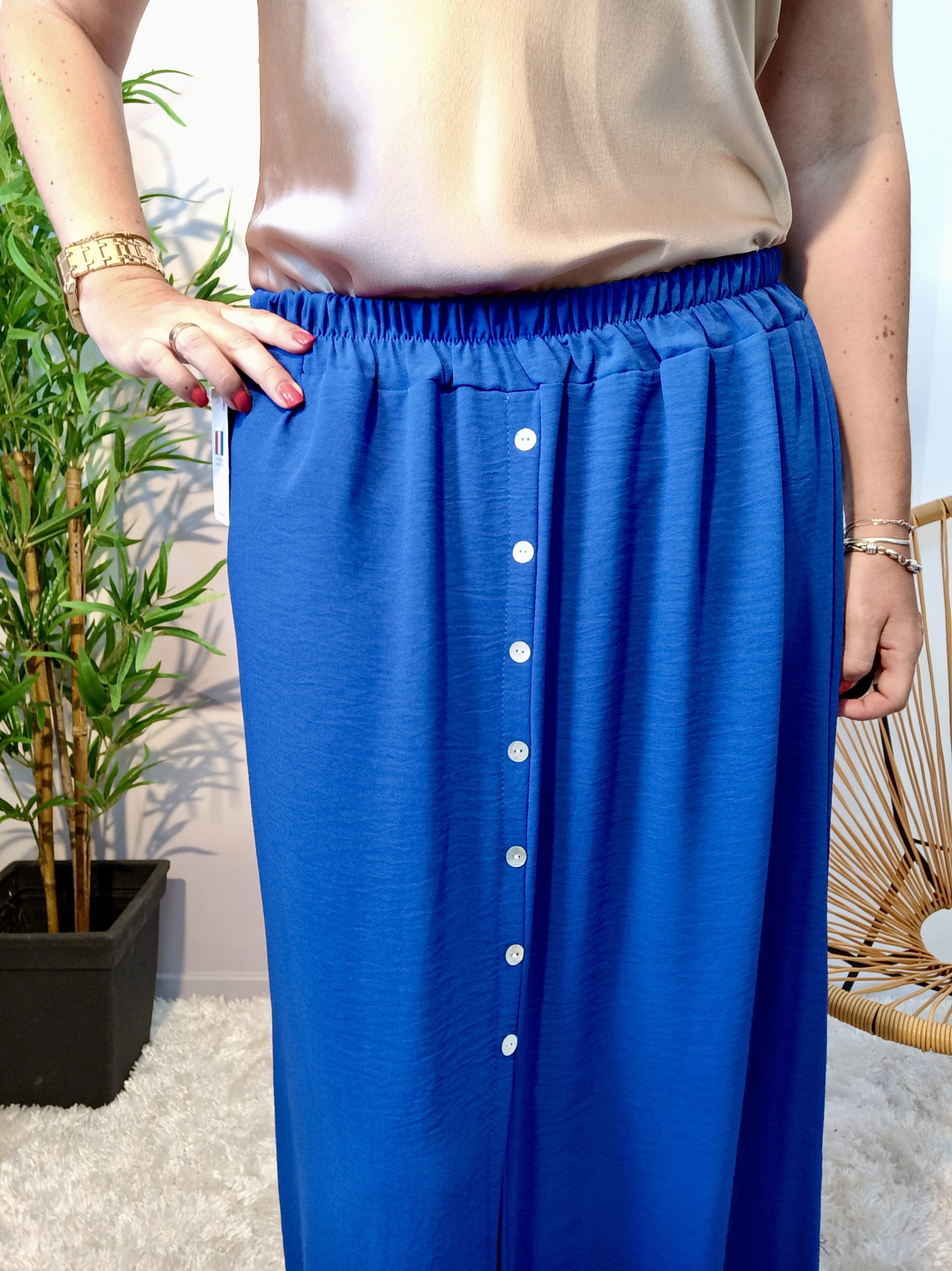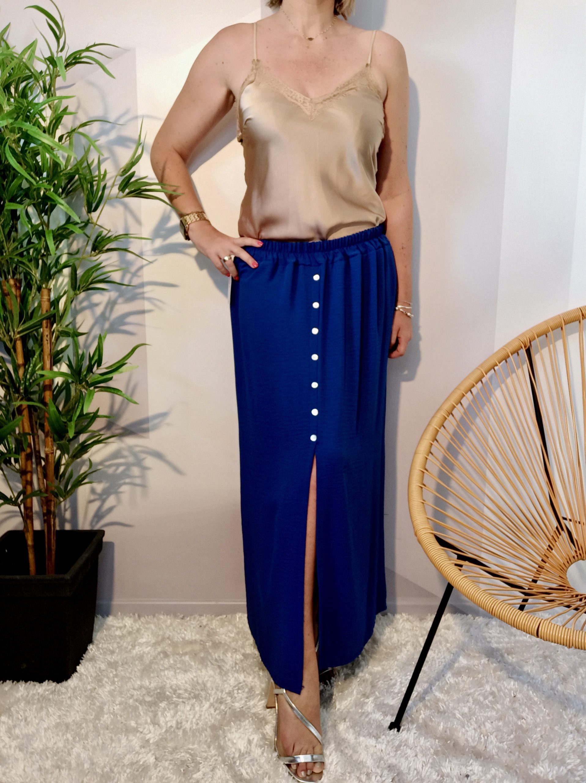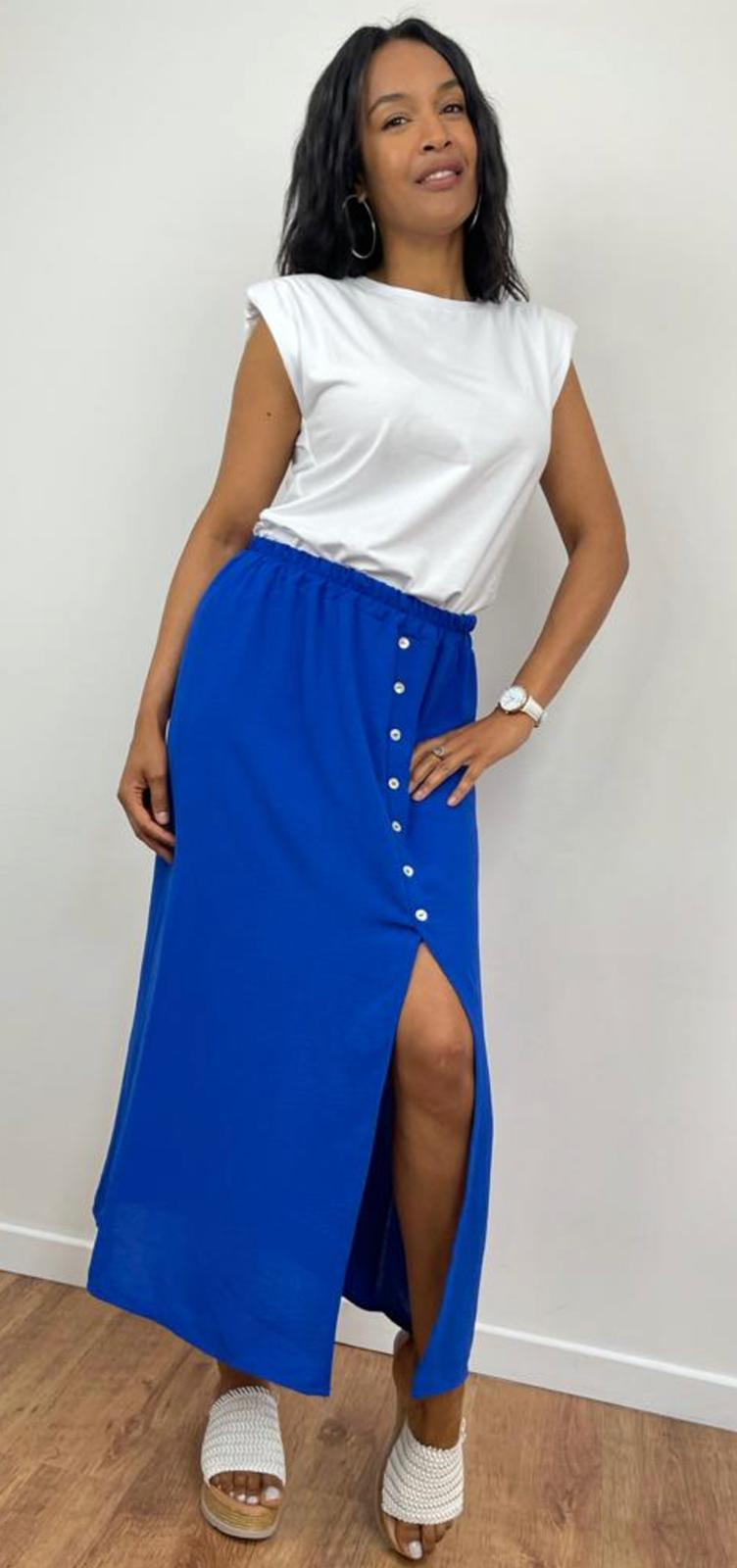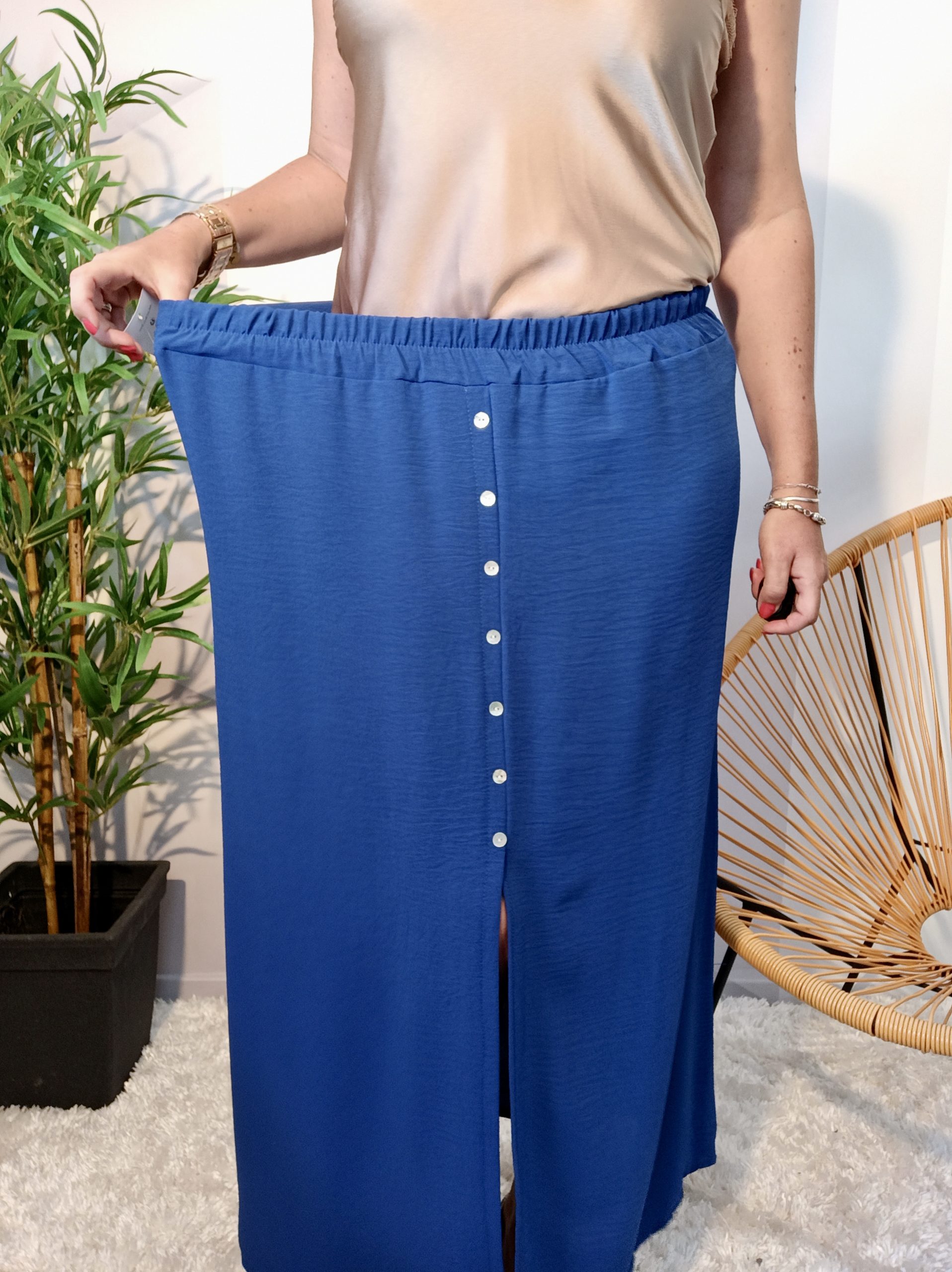 Très jolie jupe fendue au niveau du genoux avec des boutons en coquillages naturels (faux boutonnage).