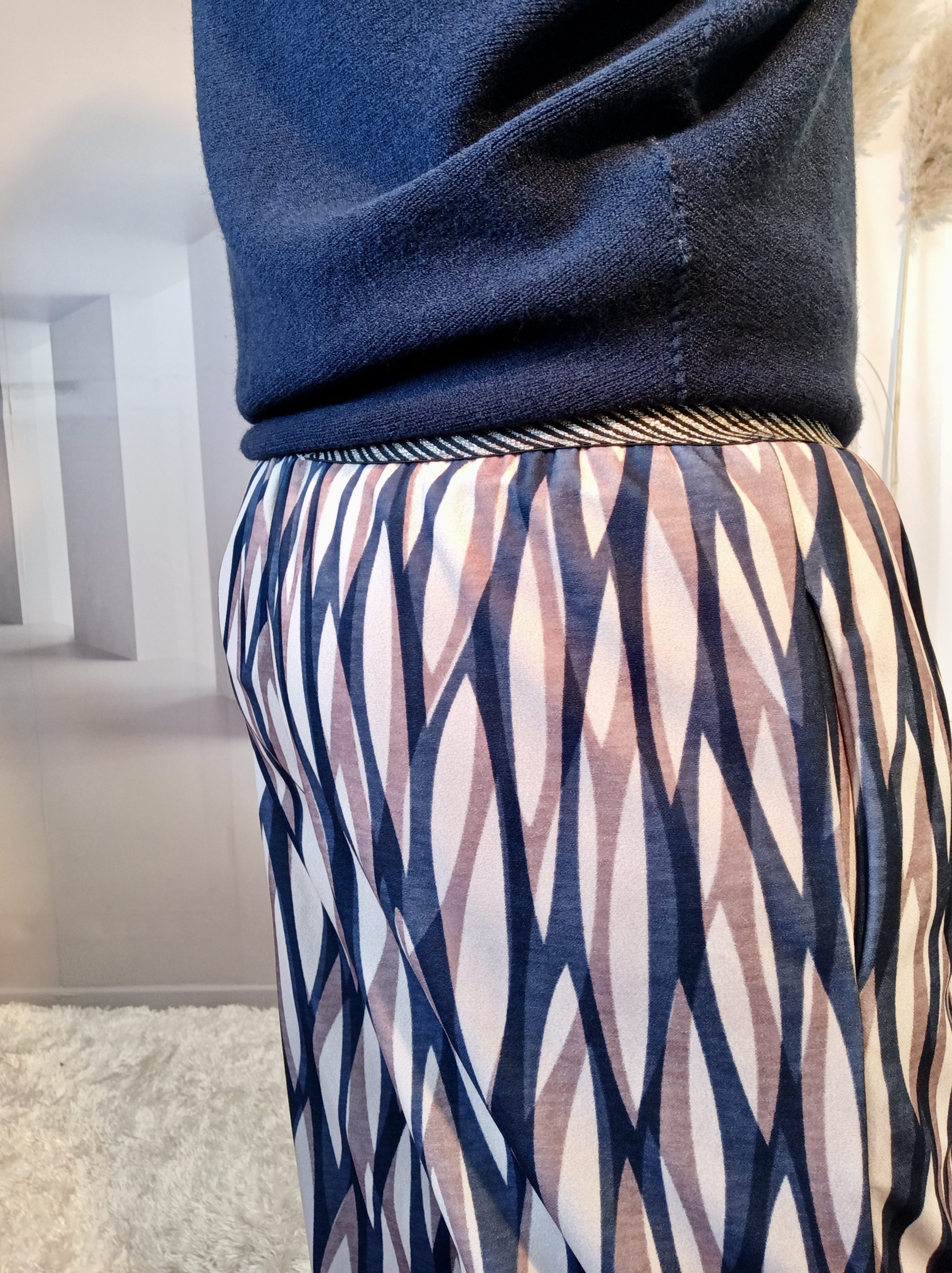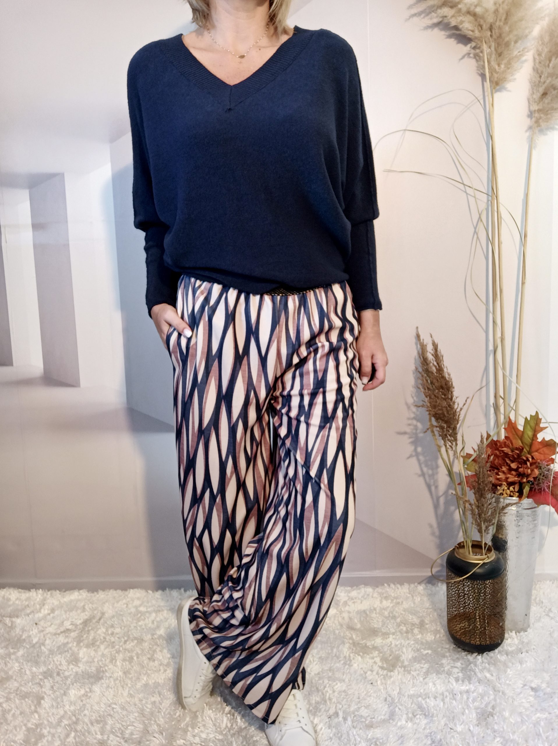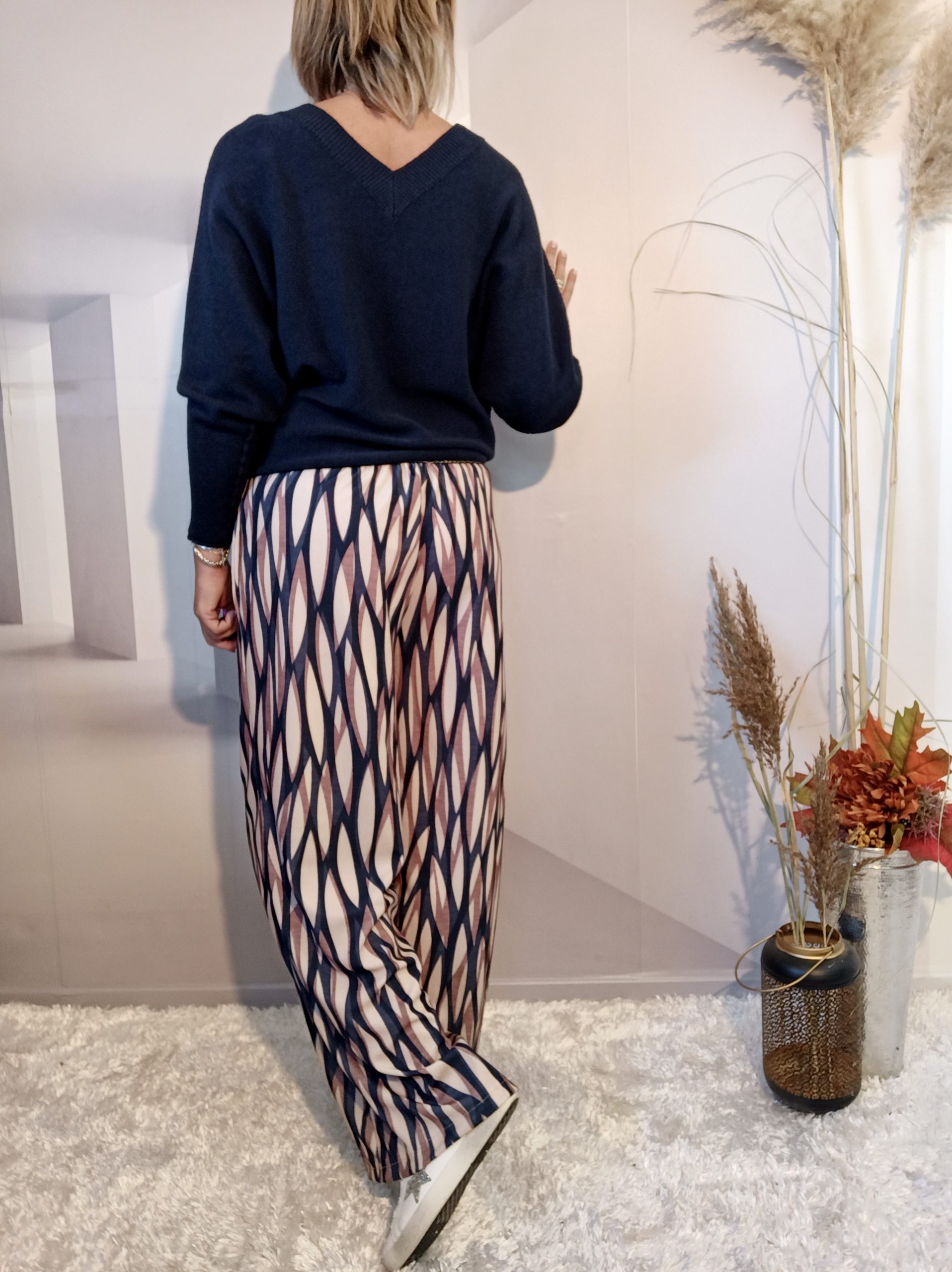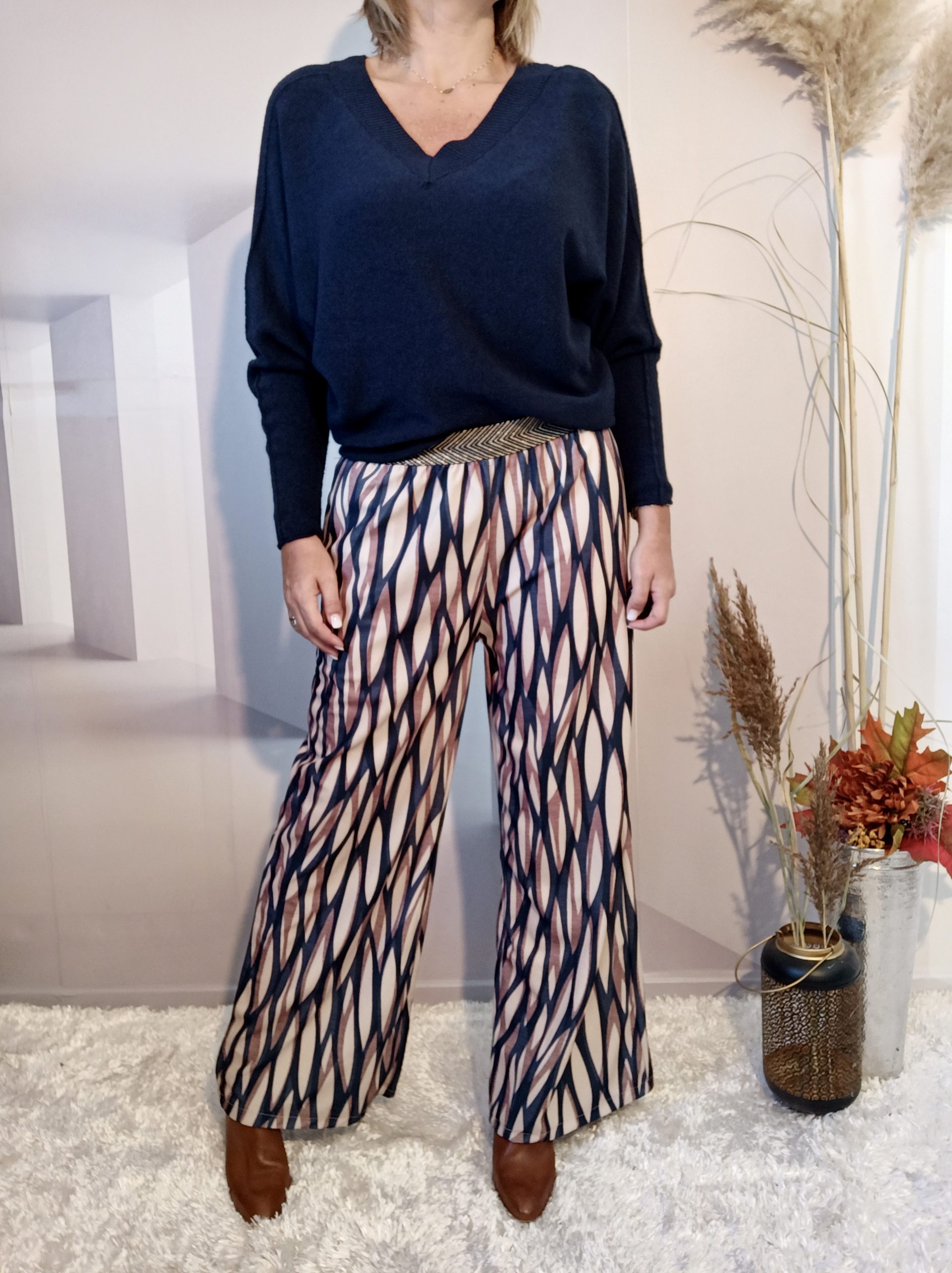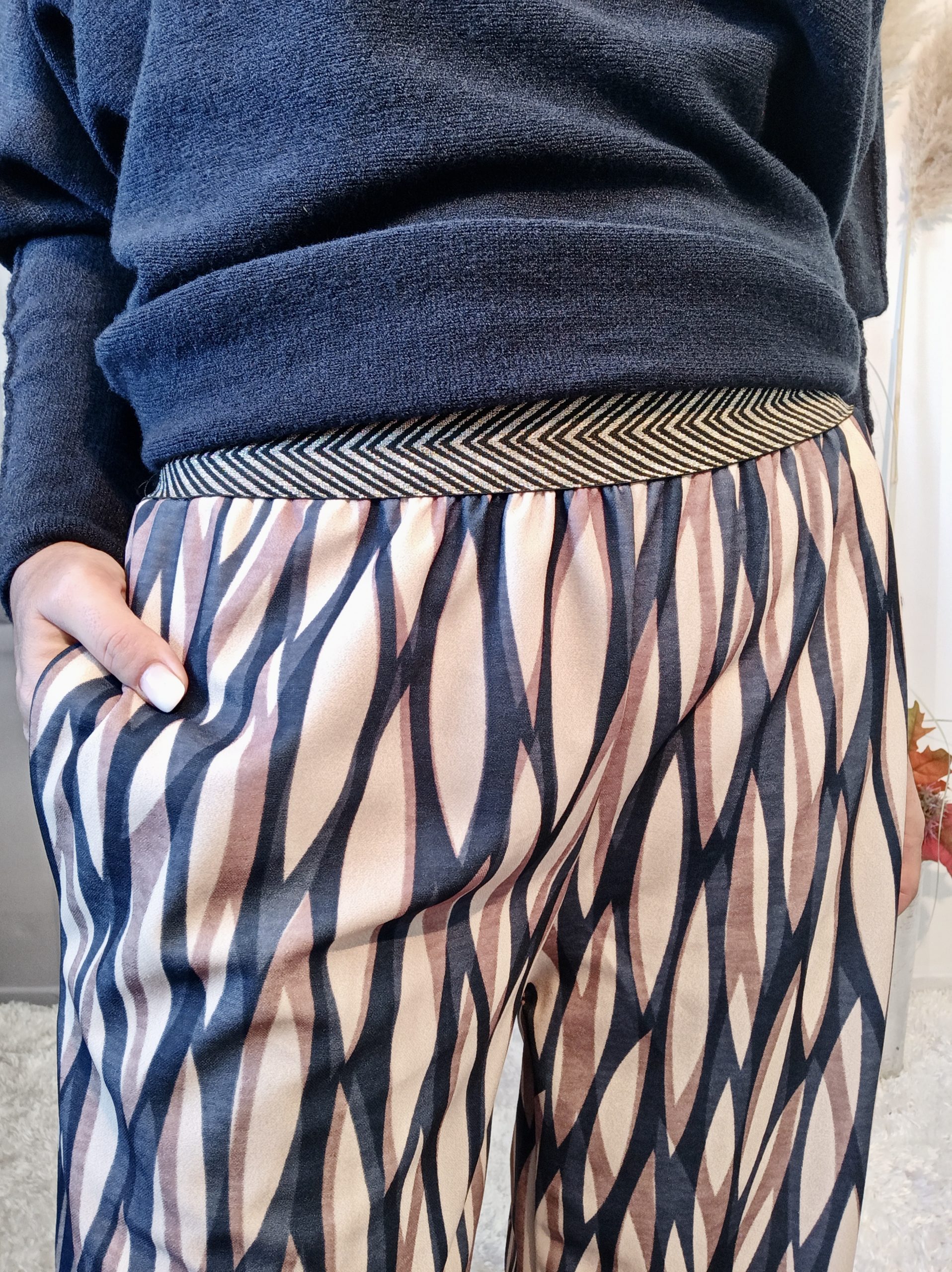 Superbe pantalon style Palazzo avec un joli tombé, 2 poches et ceinture élastiquée noire et or.