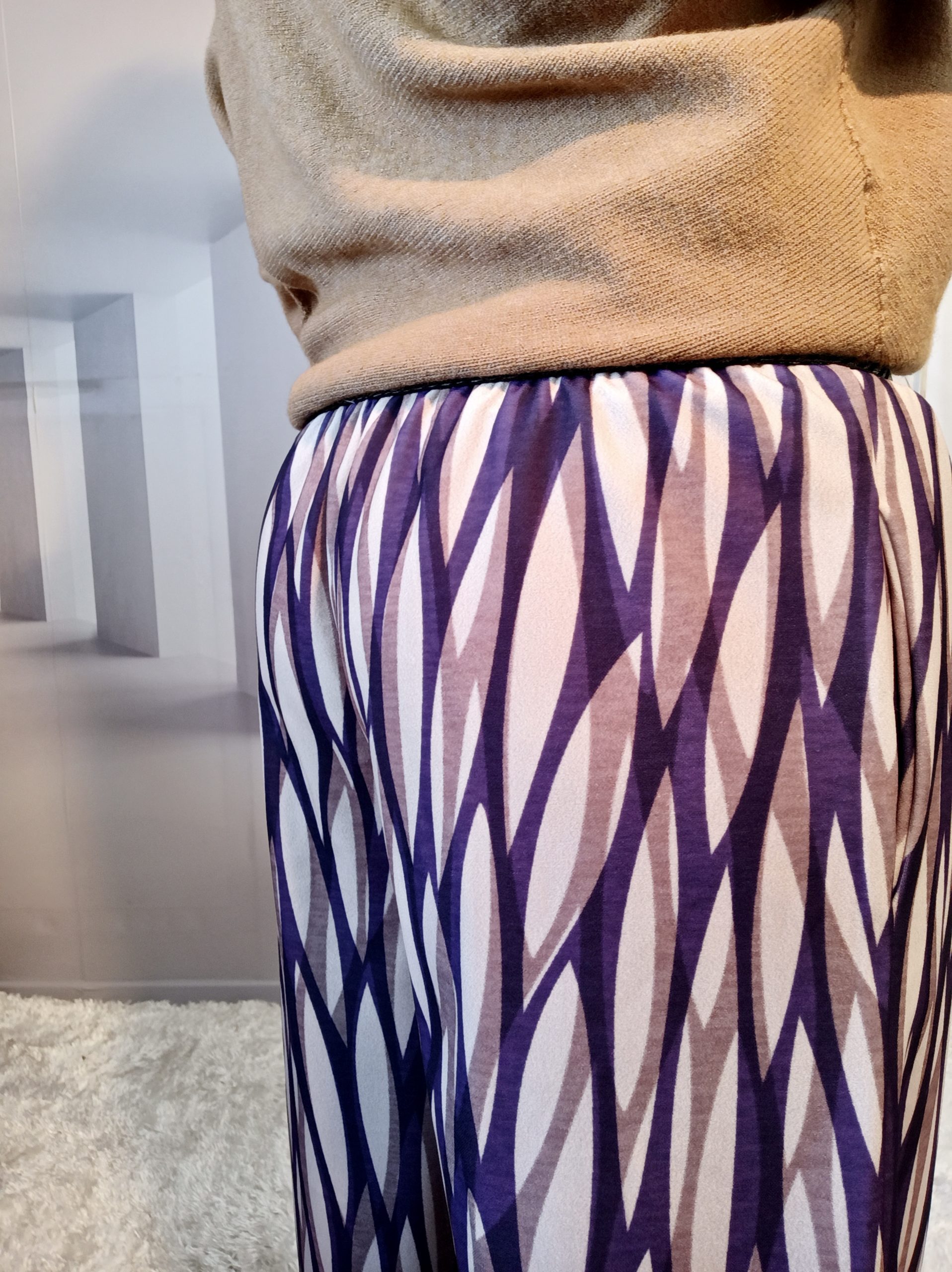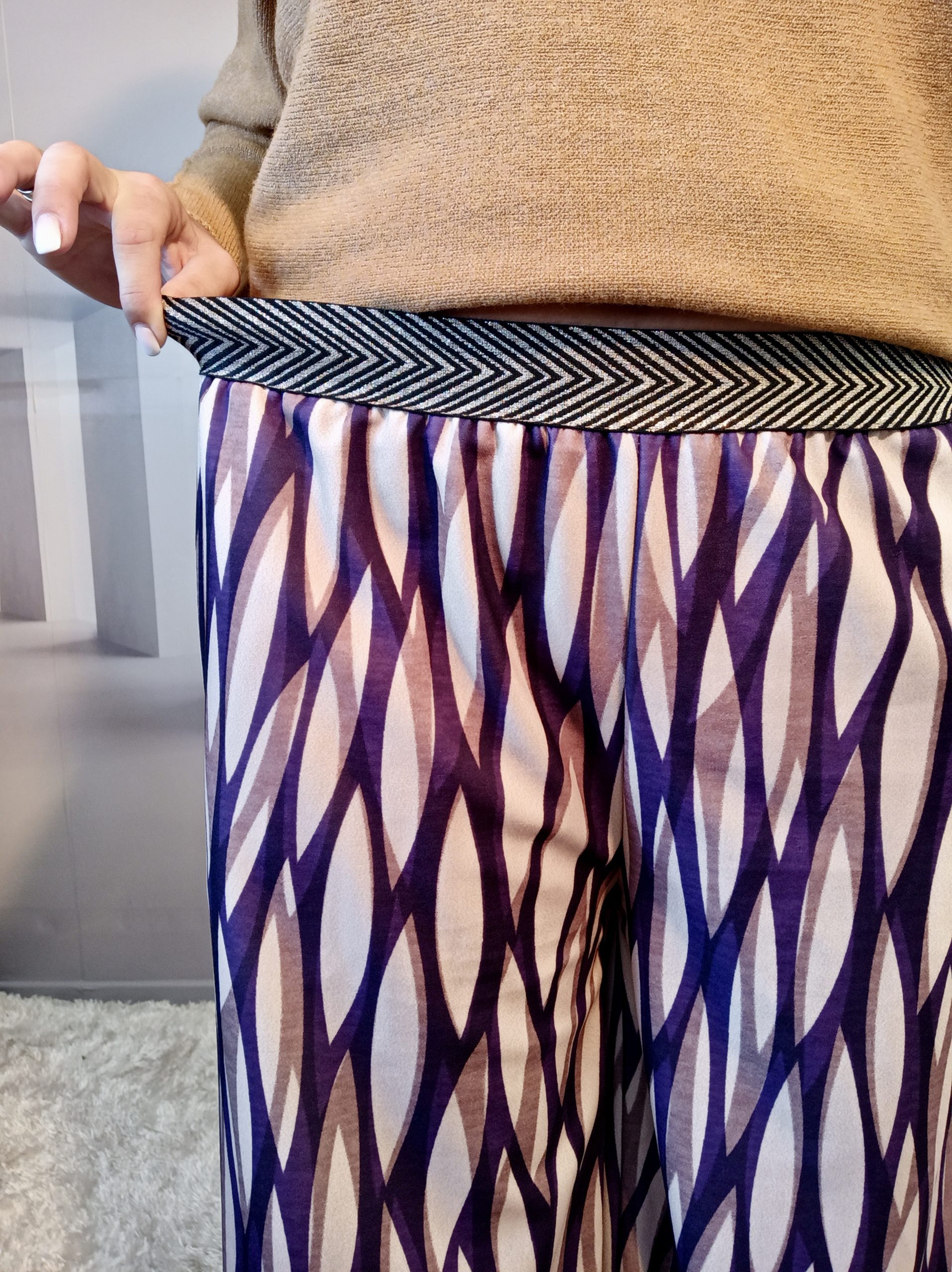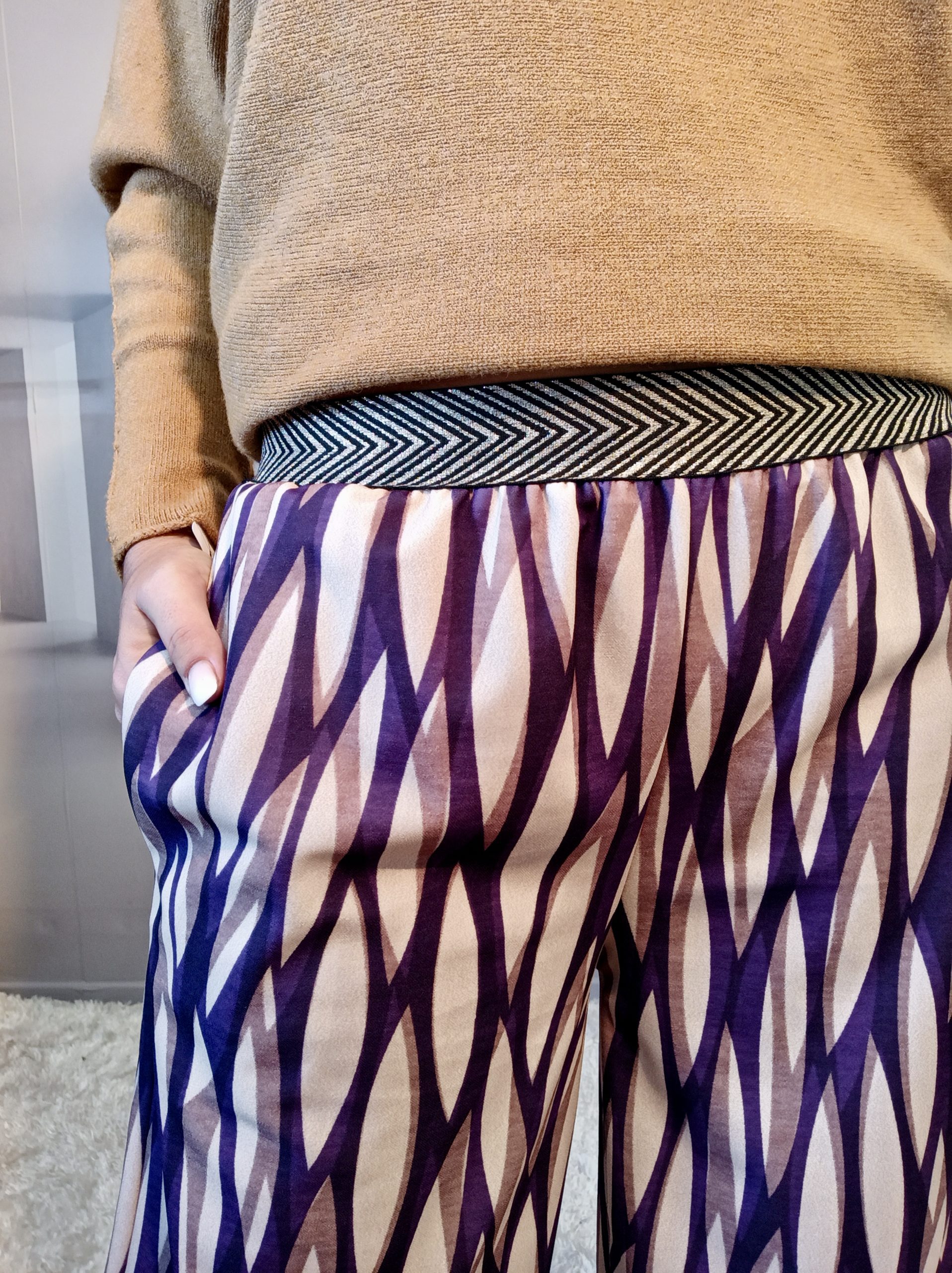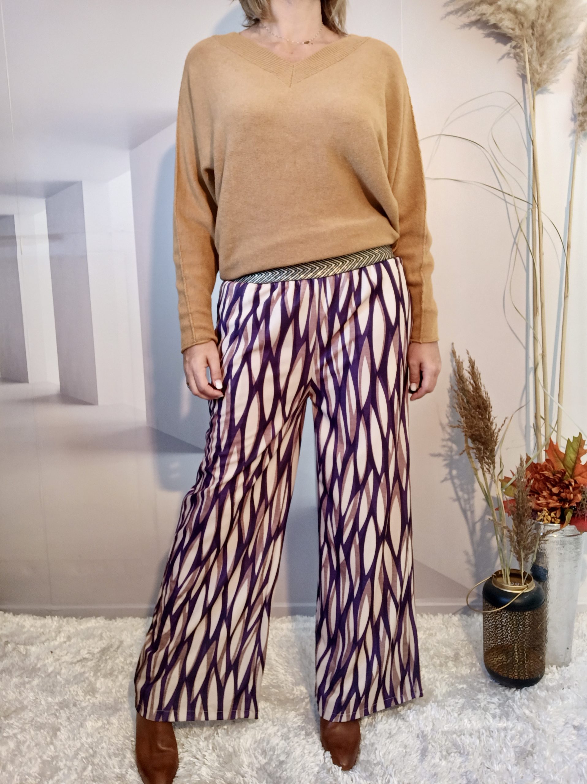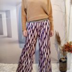 Superbe pantalon style Palazzo avec un joli tombé, 2 poches et ceinture élastiquée noire et or.