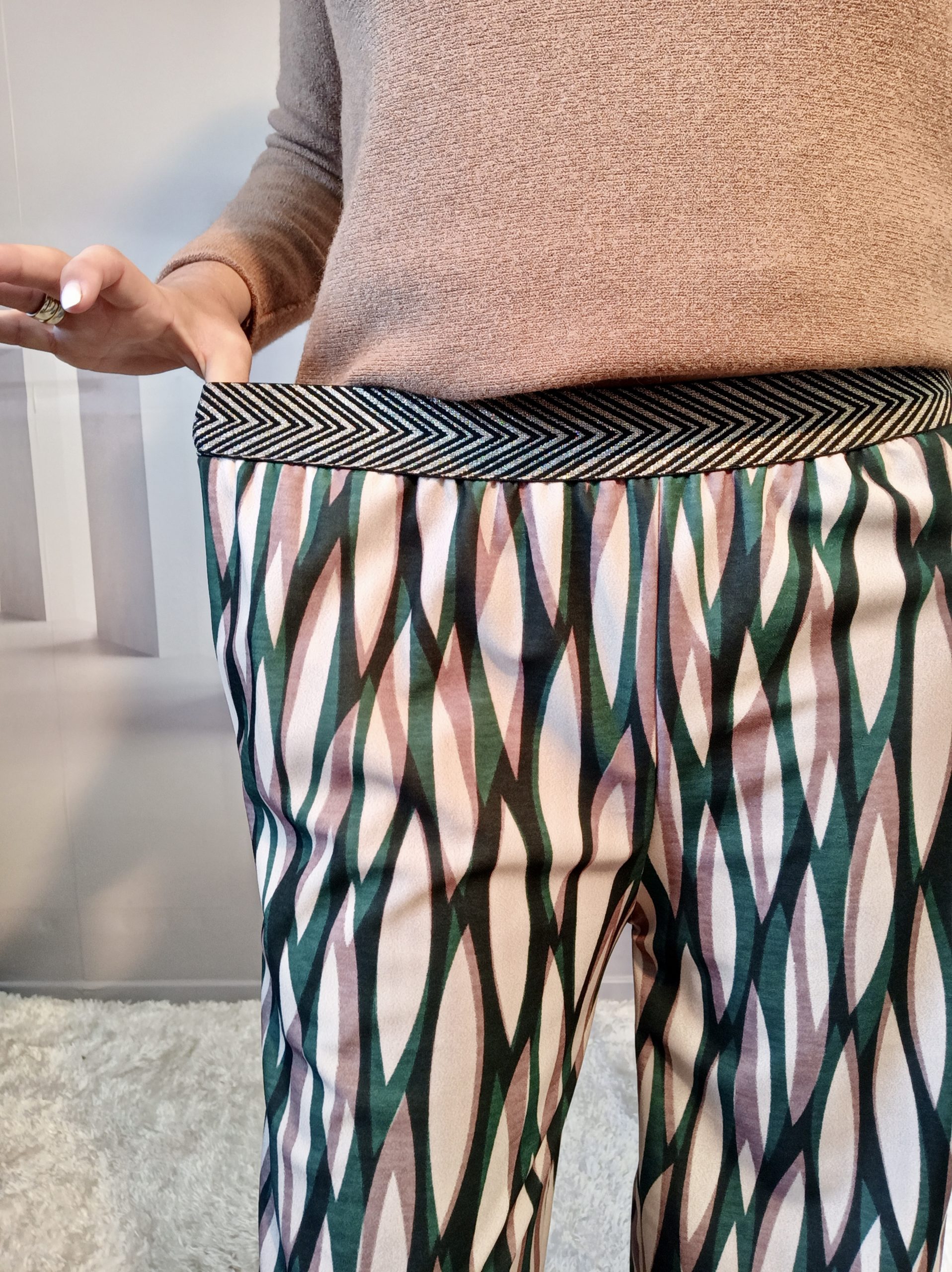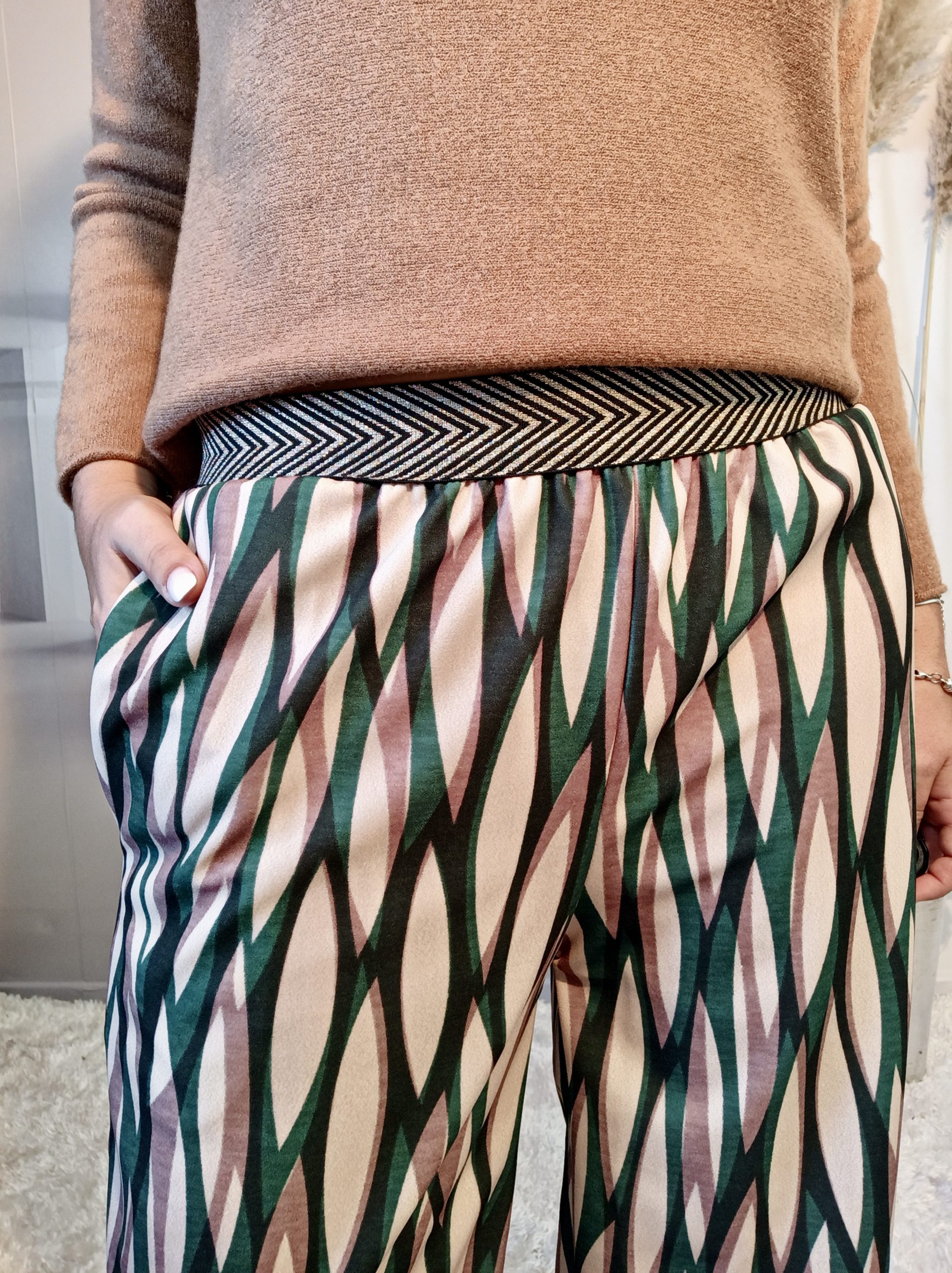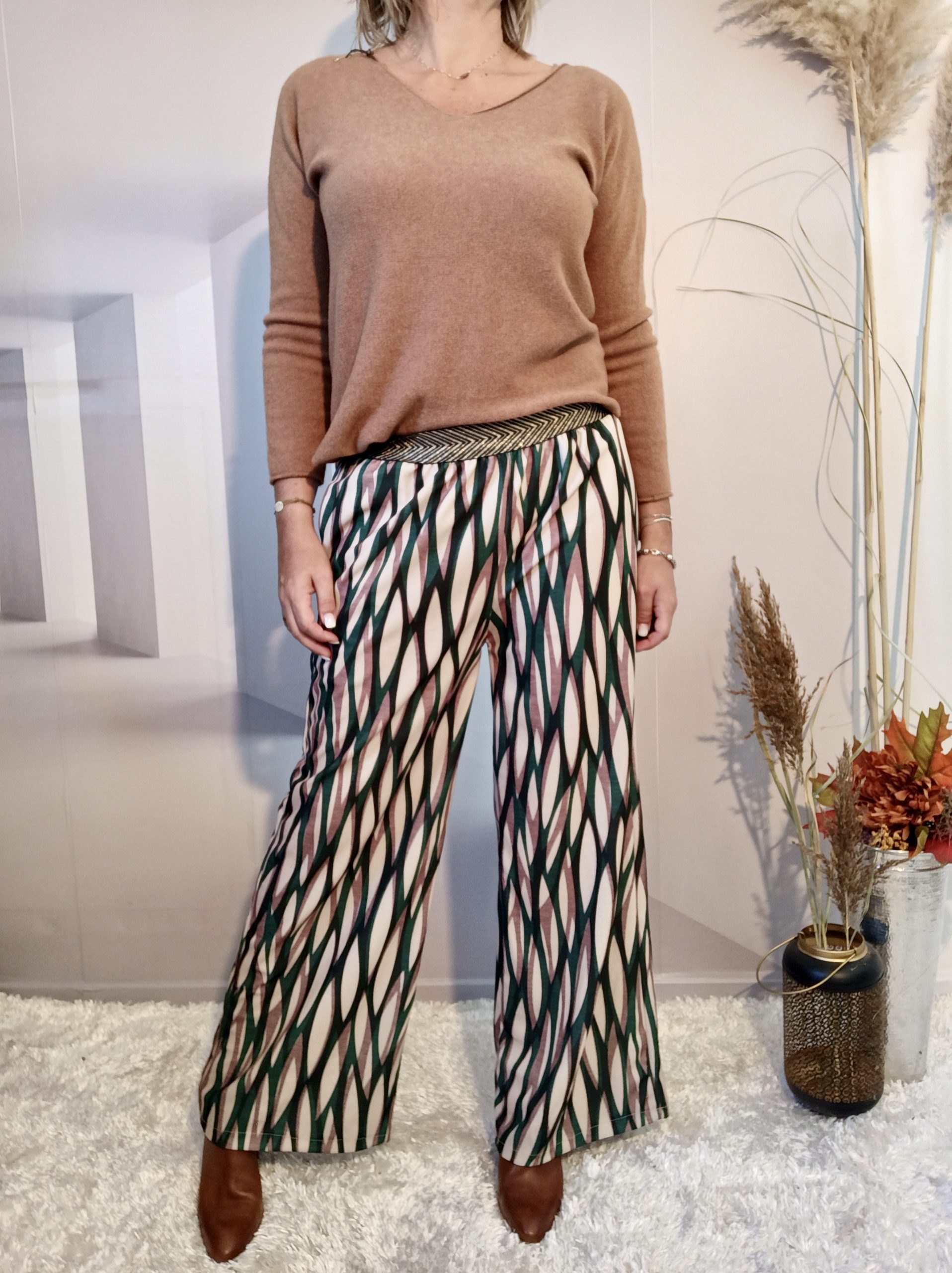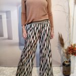 Superbe pantalon style Palazzo avec un joli tombé, 2 poches et ceinture élastiquée noire et or.