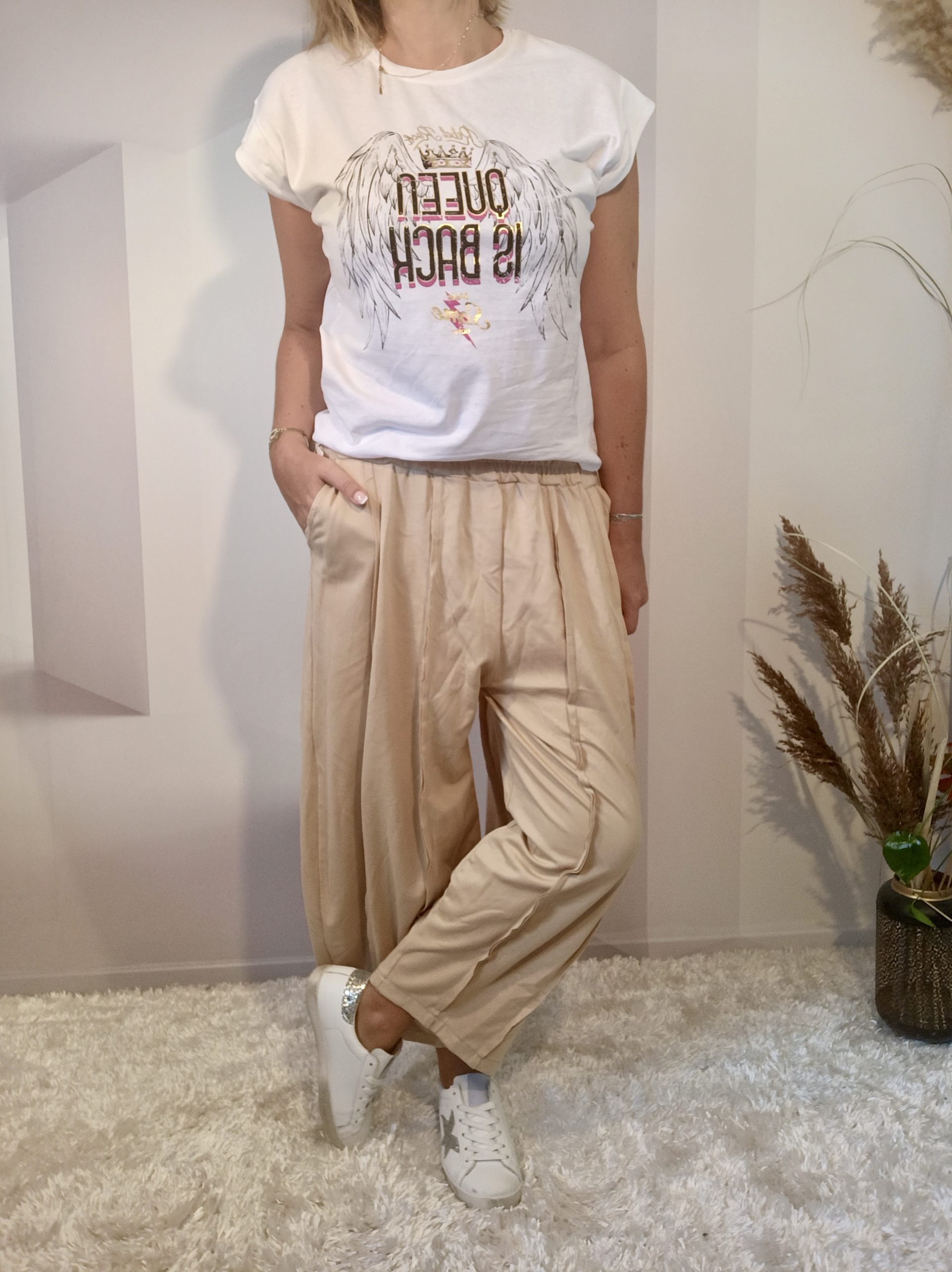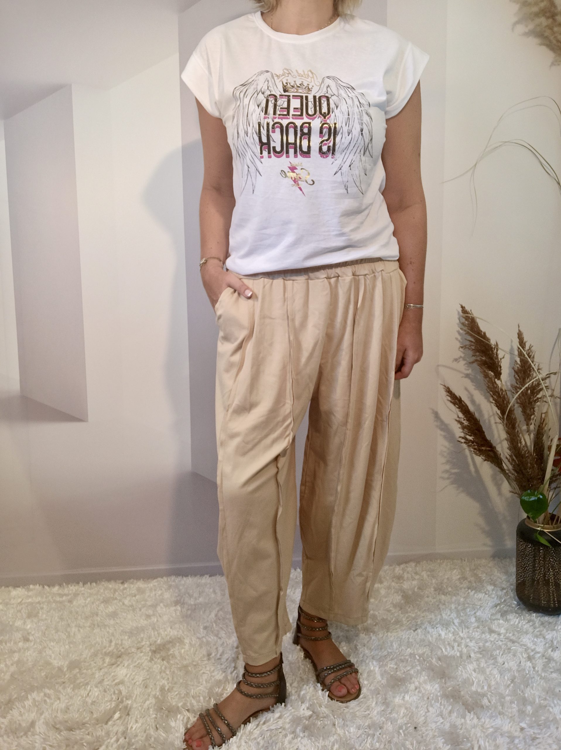 Pantalon type saroual mum par sa coupe ultra confort & sa taille élastique qui feront son effet tant en talons qu’en baskets .