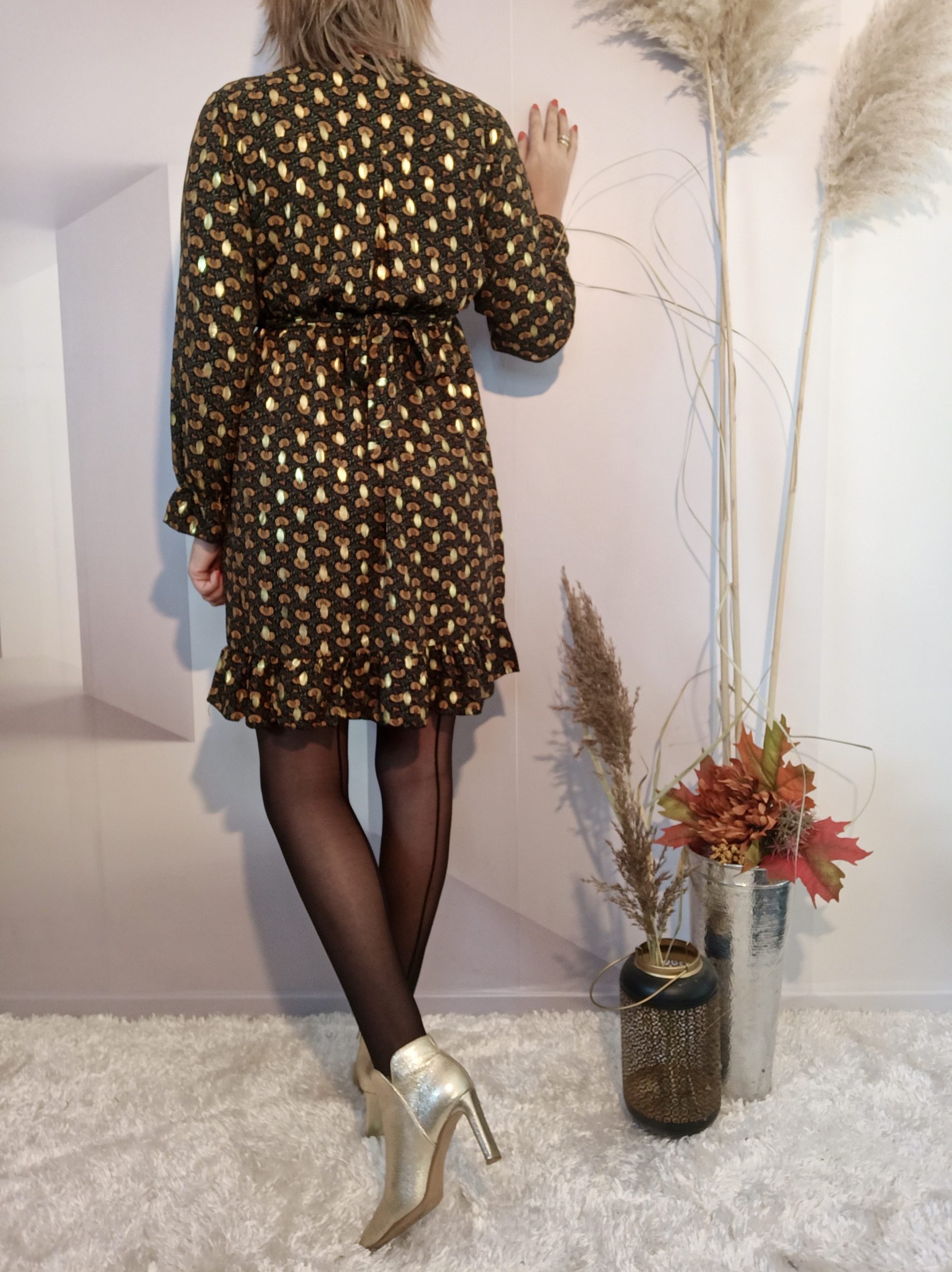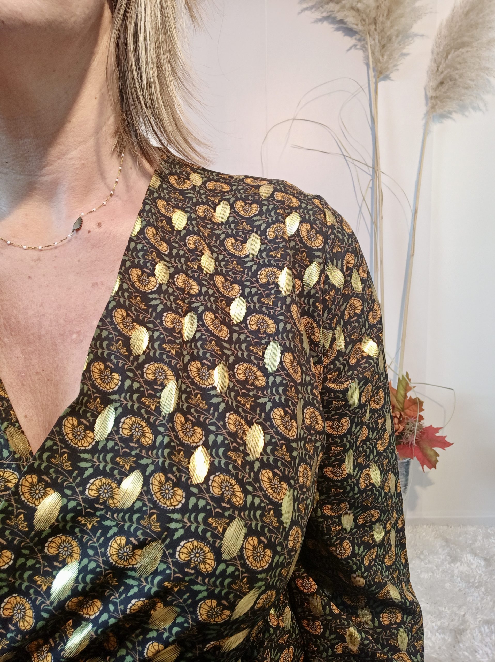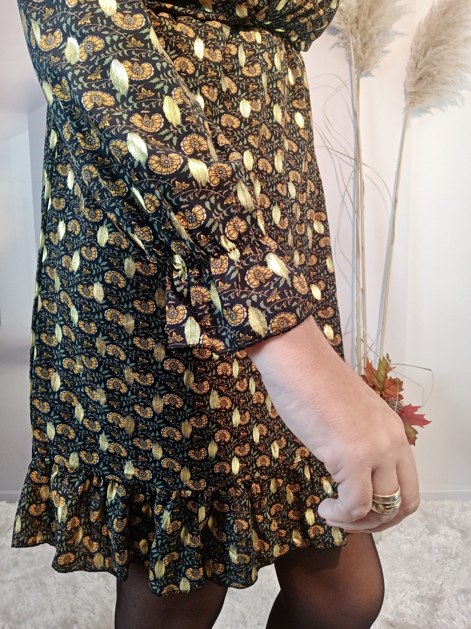 Robe fluide manches longues élastiquées à porter en toute saison et pour les fêtes avec ses touches dorées.