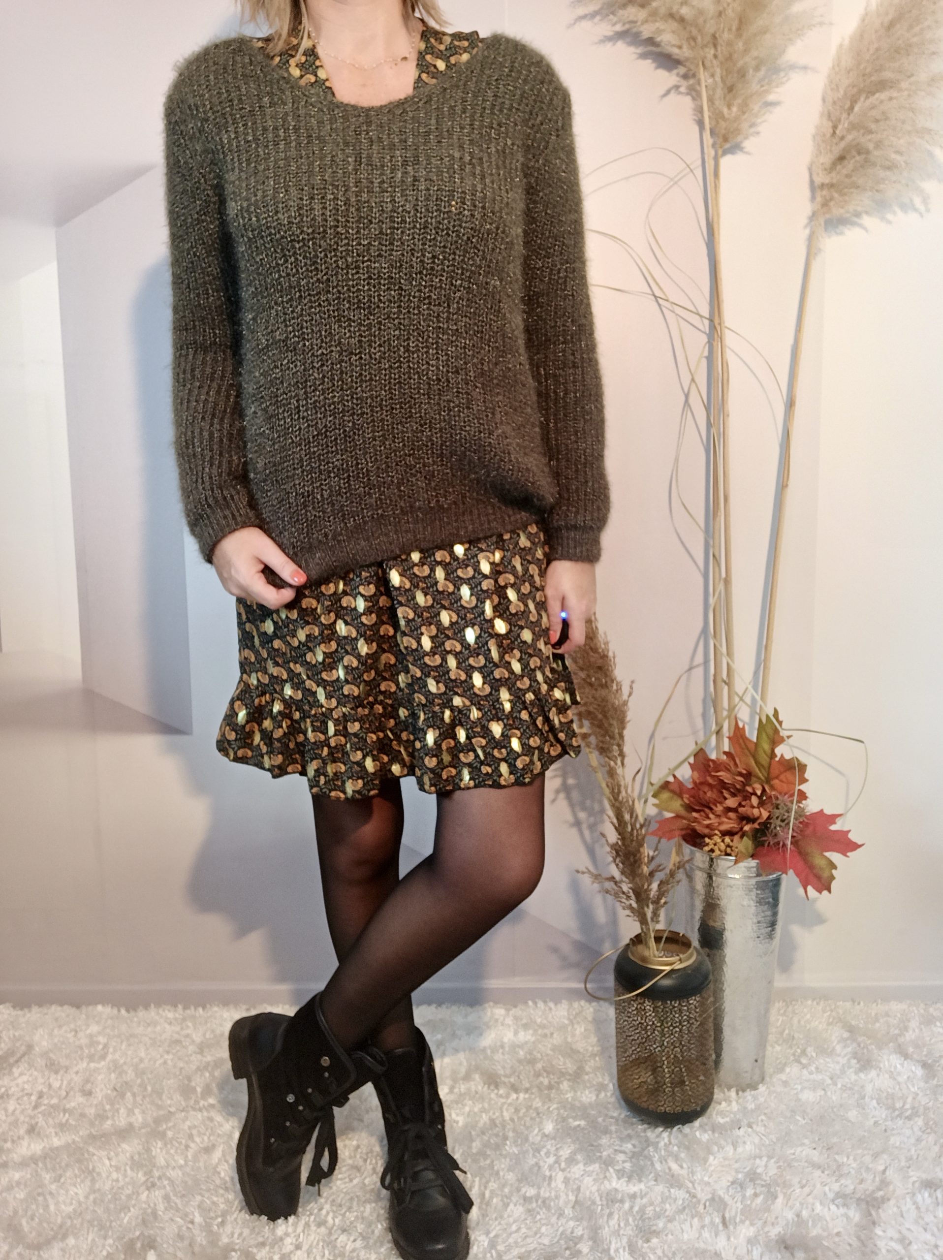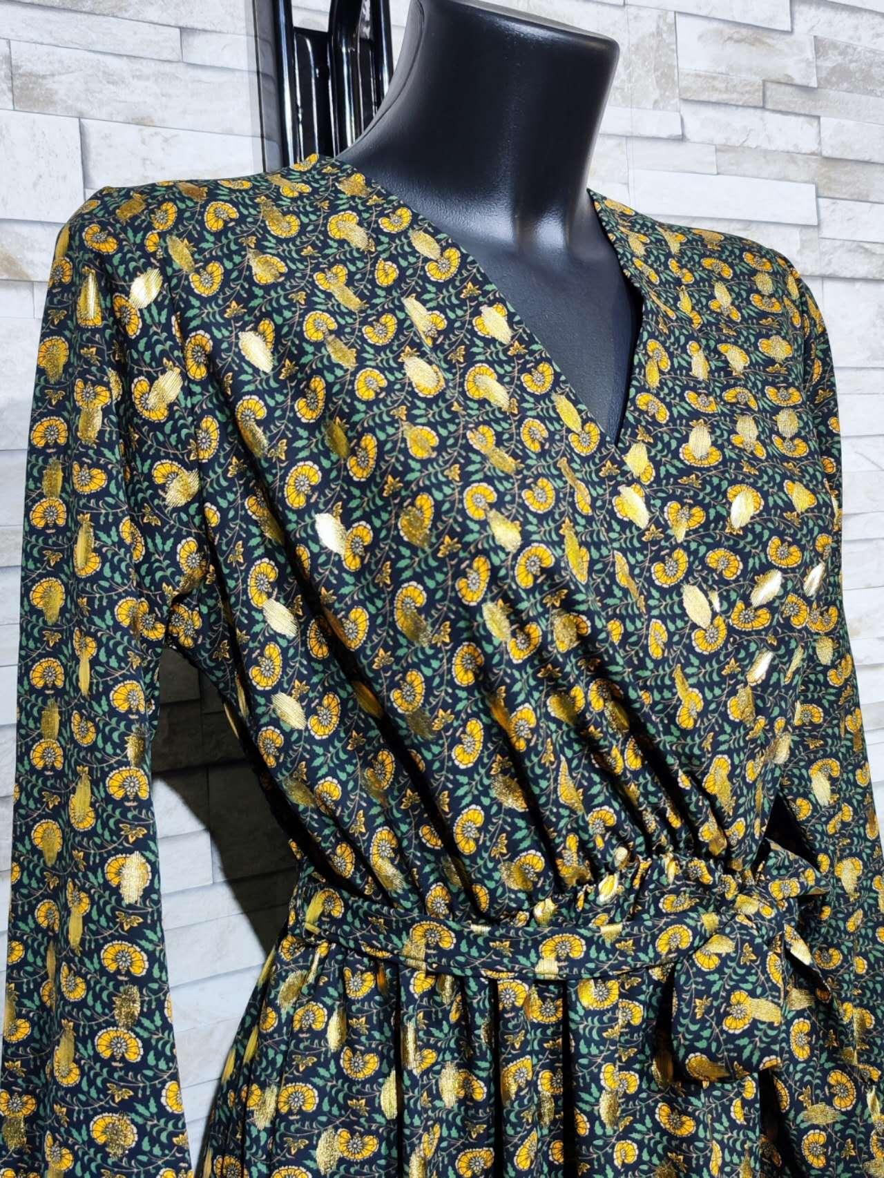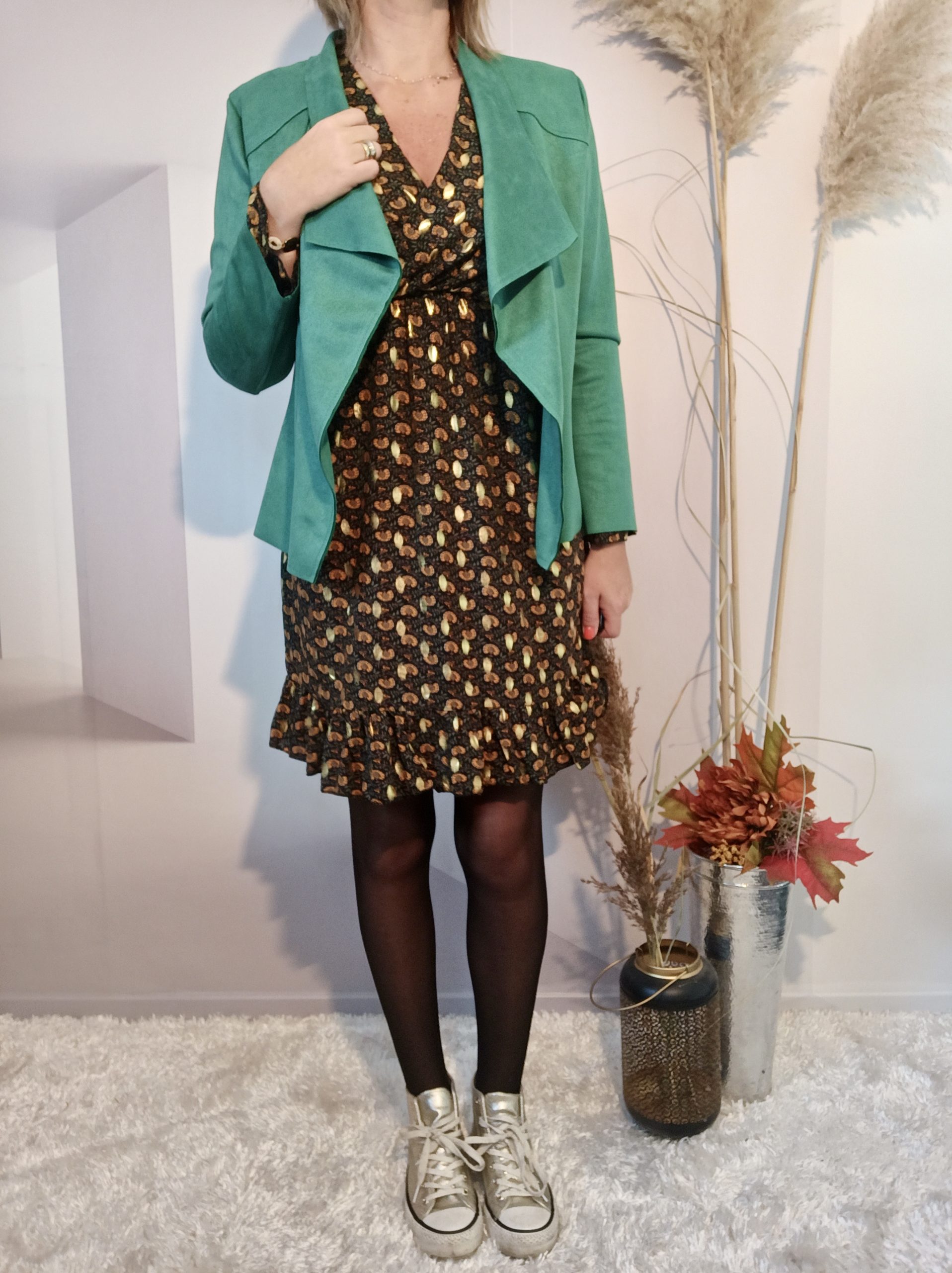 Robe fluide manches longues élastiquées à porter en toute saison et pour les fêtes avec ses touches dorées.
