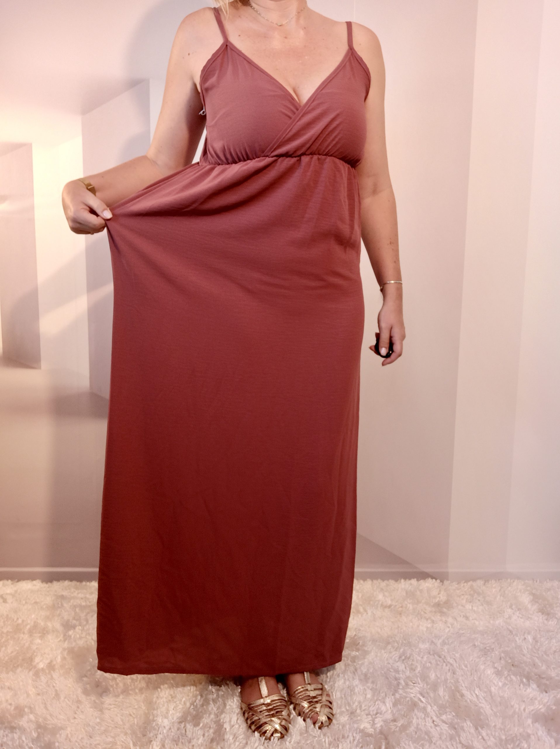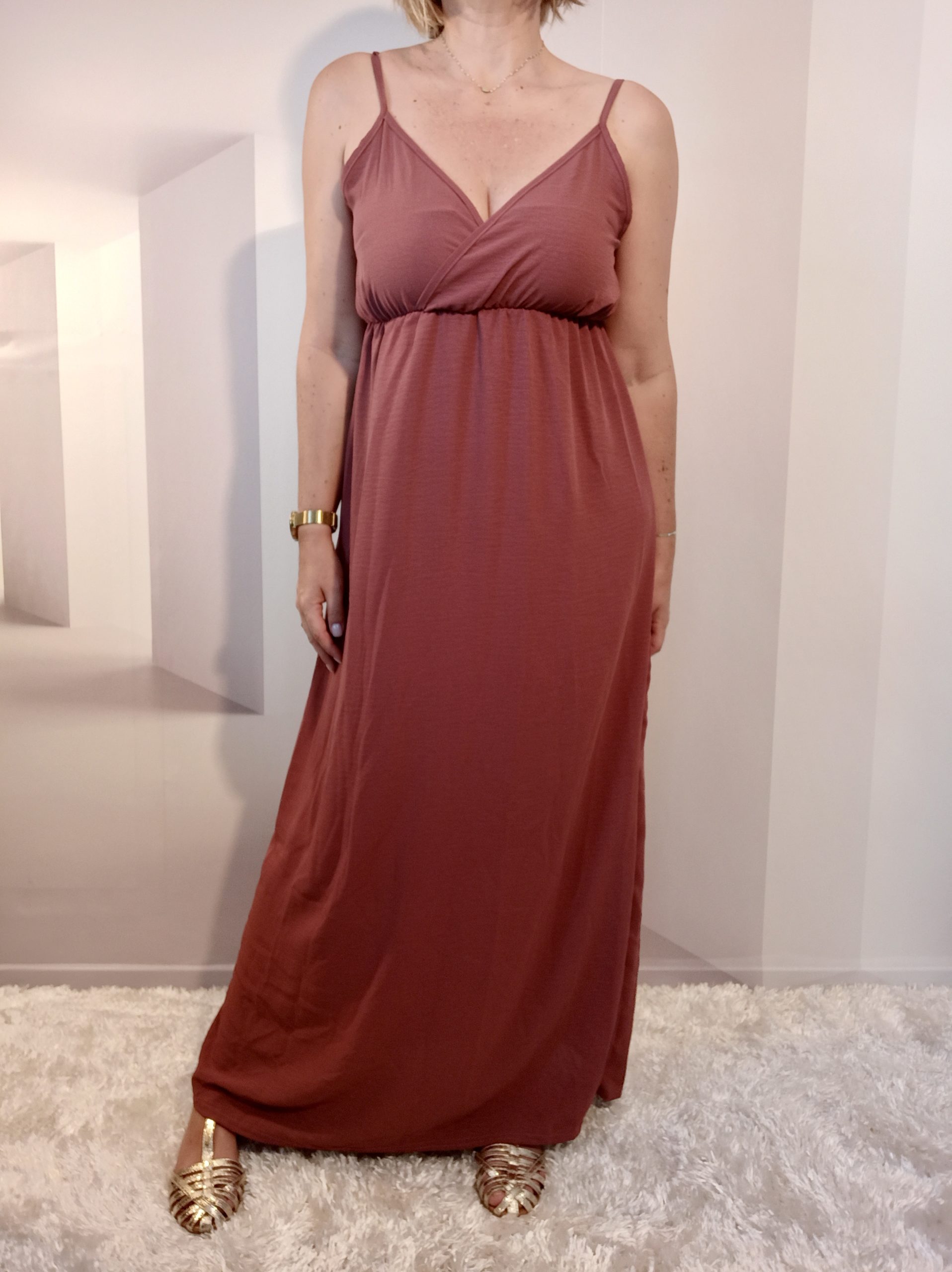 Robe longue cache-coeur et élastiquée sous la poitrine, très agréable à porter dès le printemps !