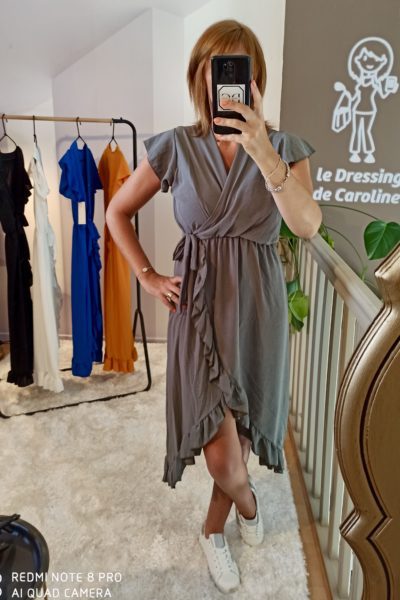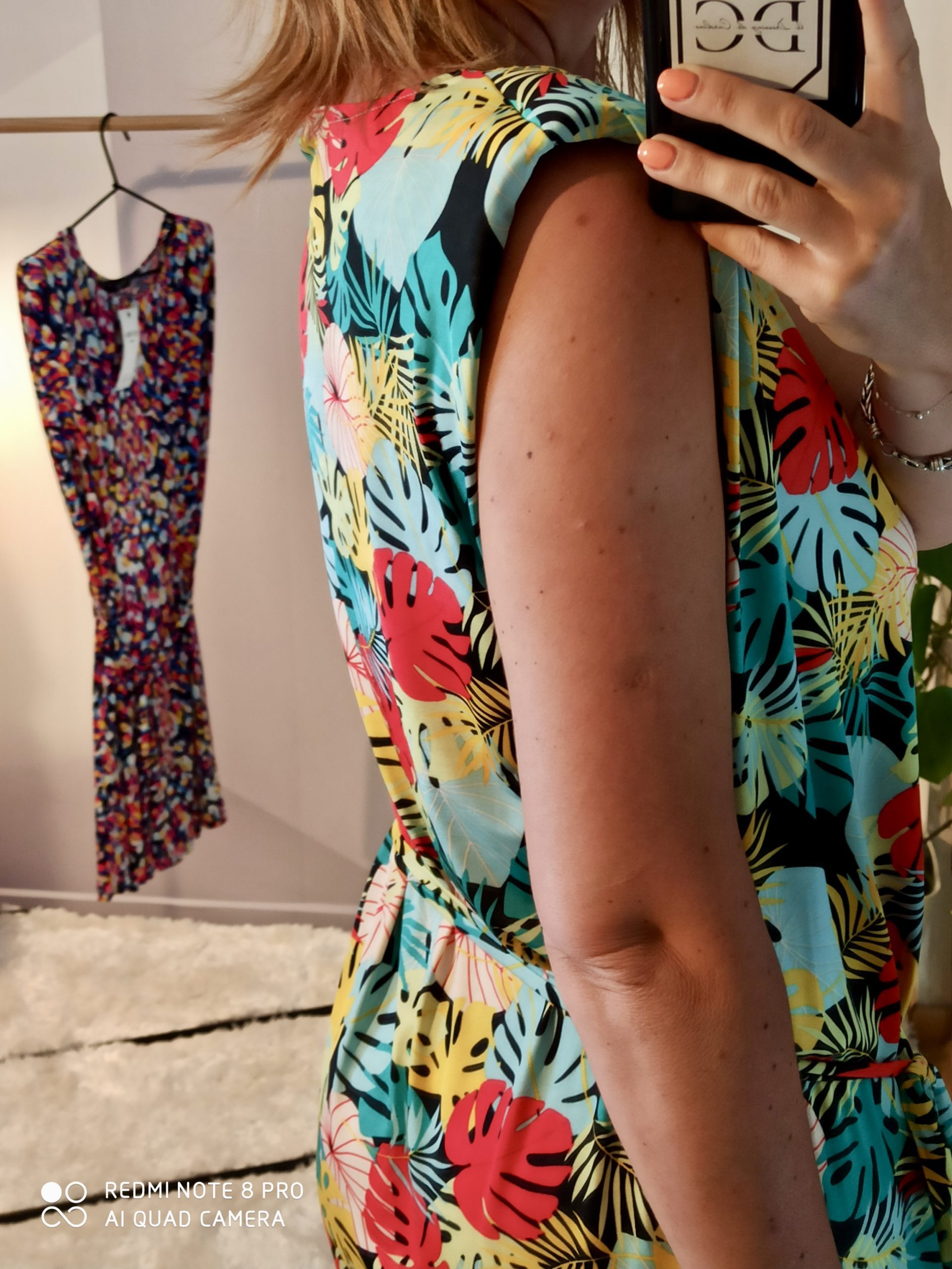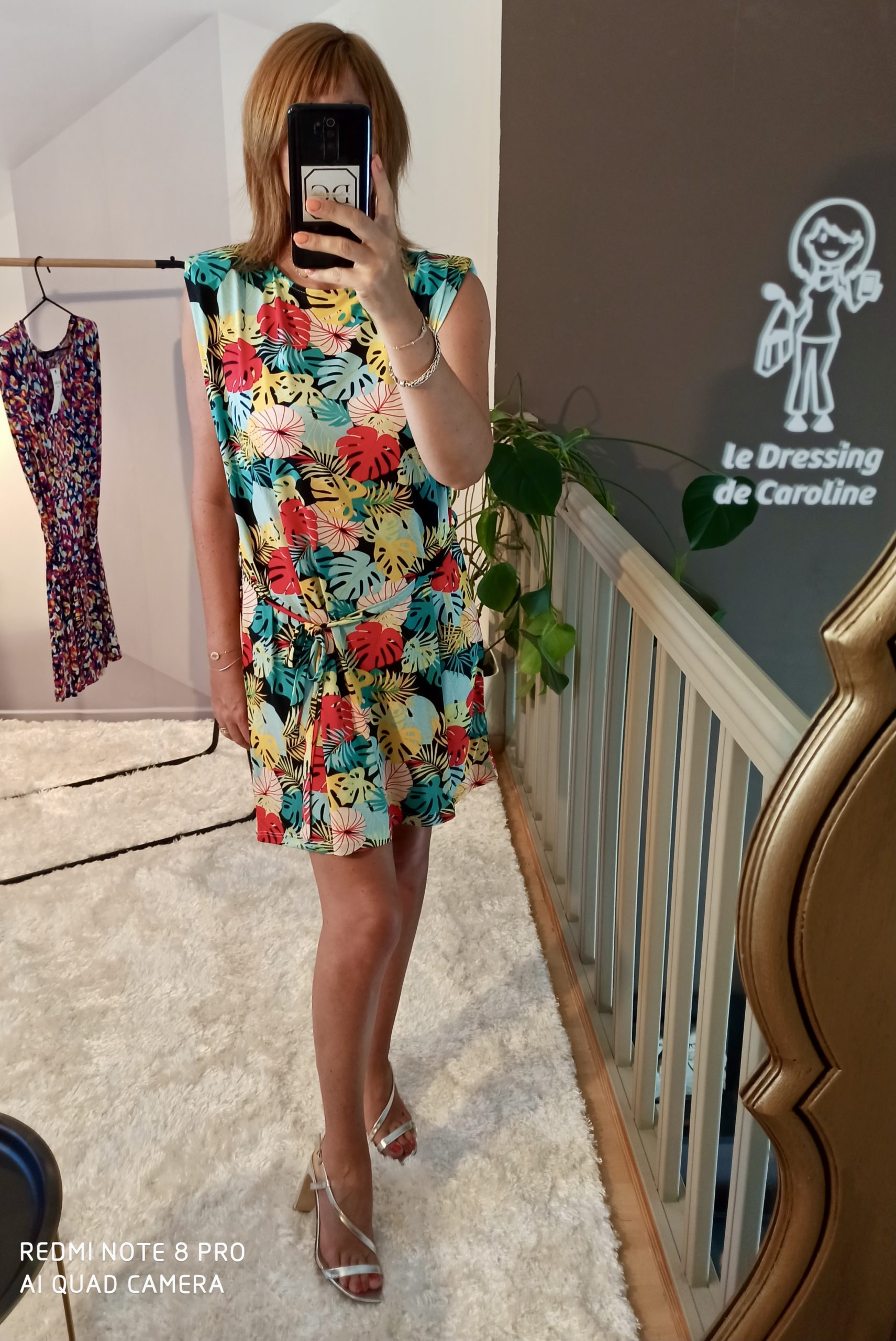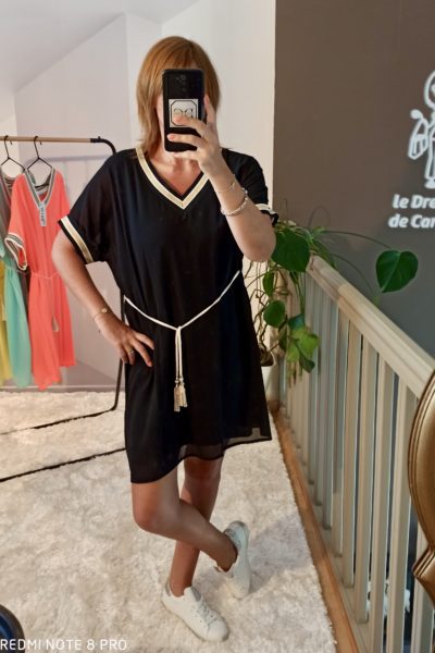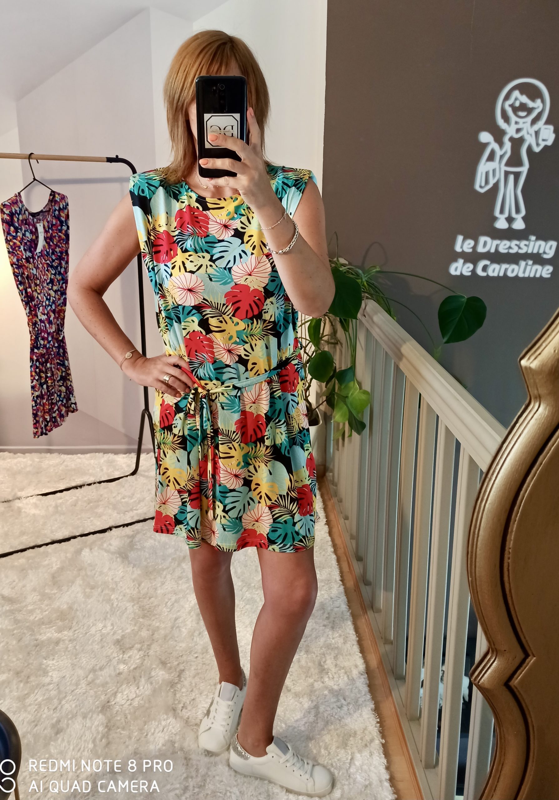 Robe au col rond avec épaulettes, coupe droite et ceinture à la taille qui vous permettra de l’ajuster à votre guise.
