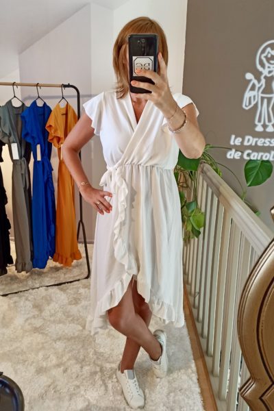 Robe courte, col cache-coeur avec volants aux manches et liseré à light gold à l’encolure.