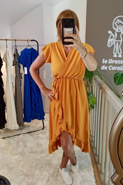Robe courte, col cache-coeur avec volants aux manches et liserĂ© Ă light gold Ă l’encolure.