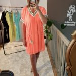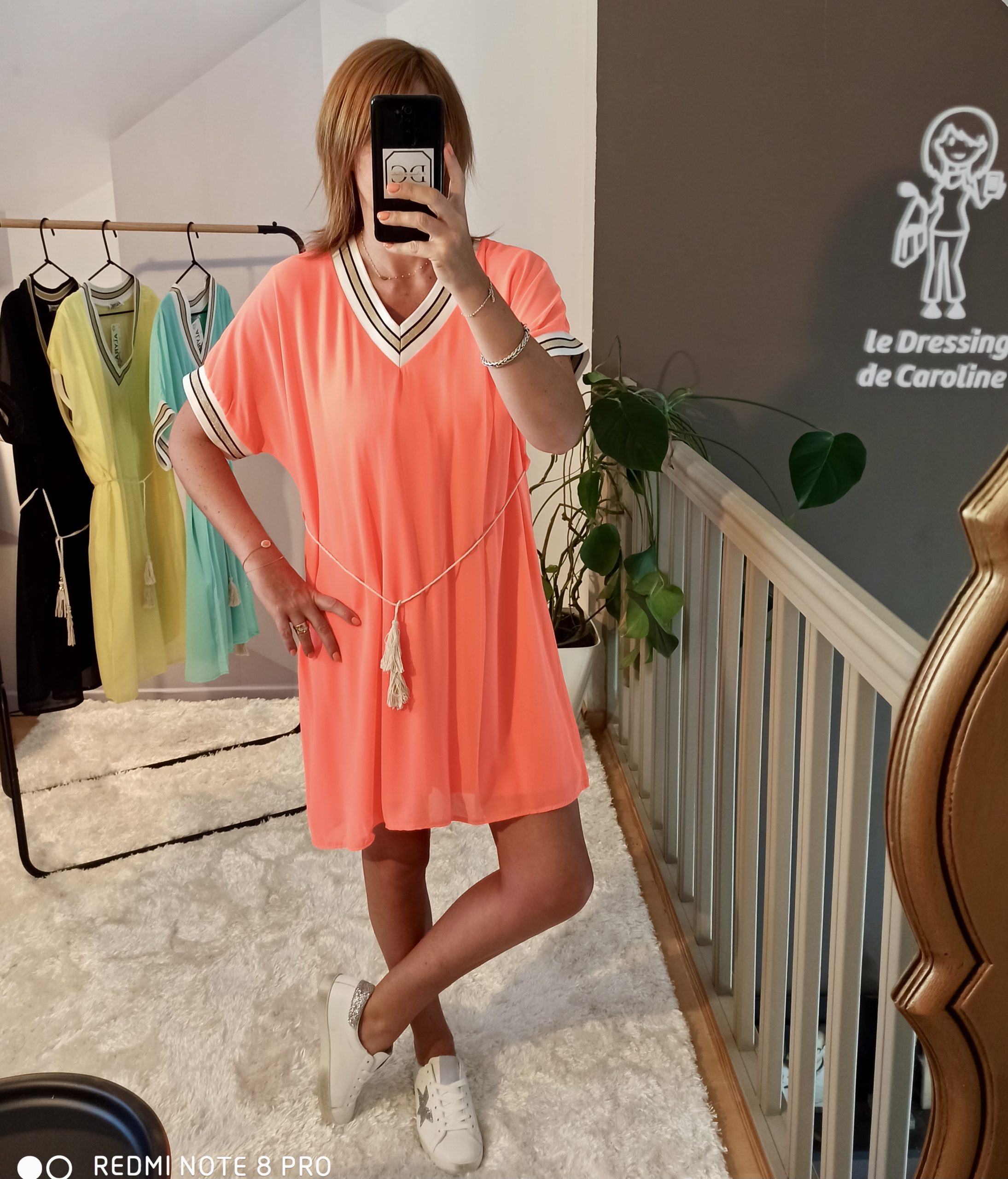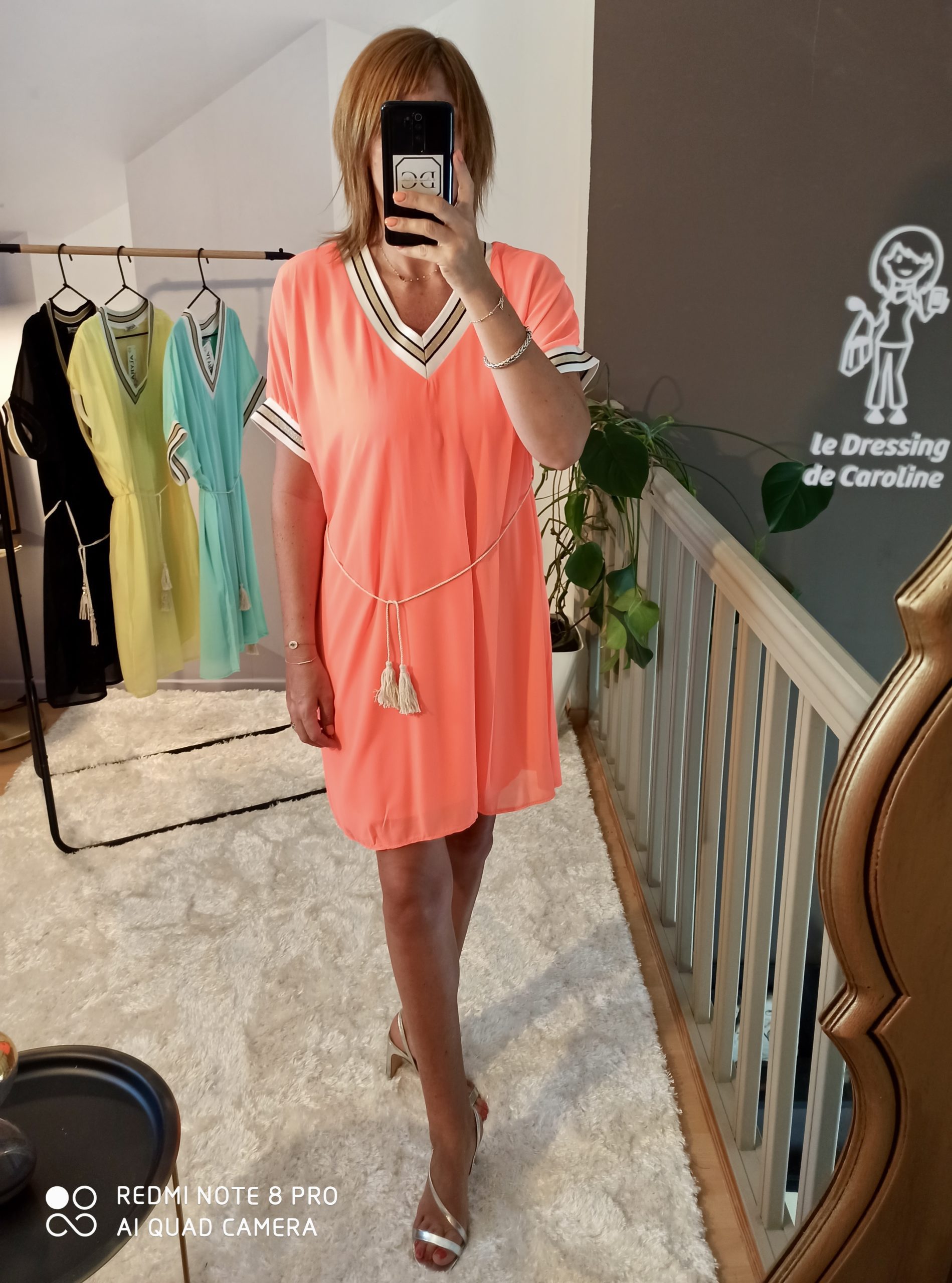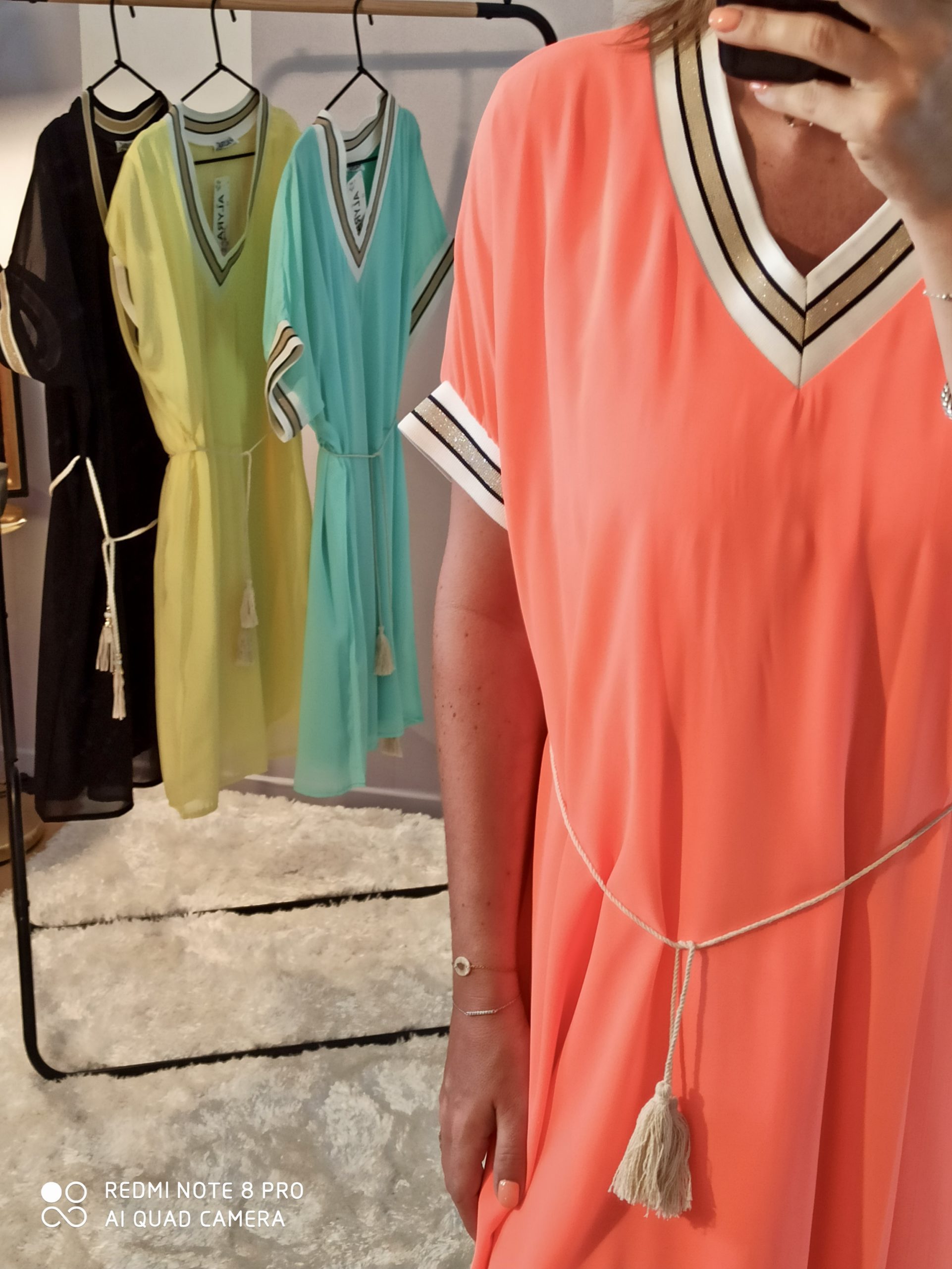 Robe fluide doublée sur toute la hauteur, sauf aux manches ce qui permet un jeu de transparence tout en légèreté.