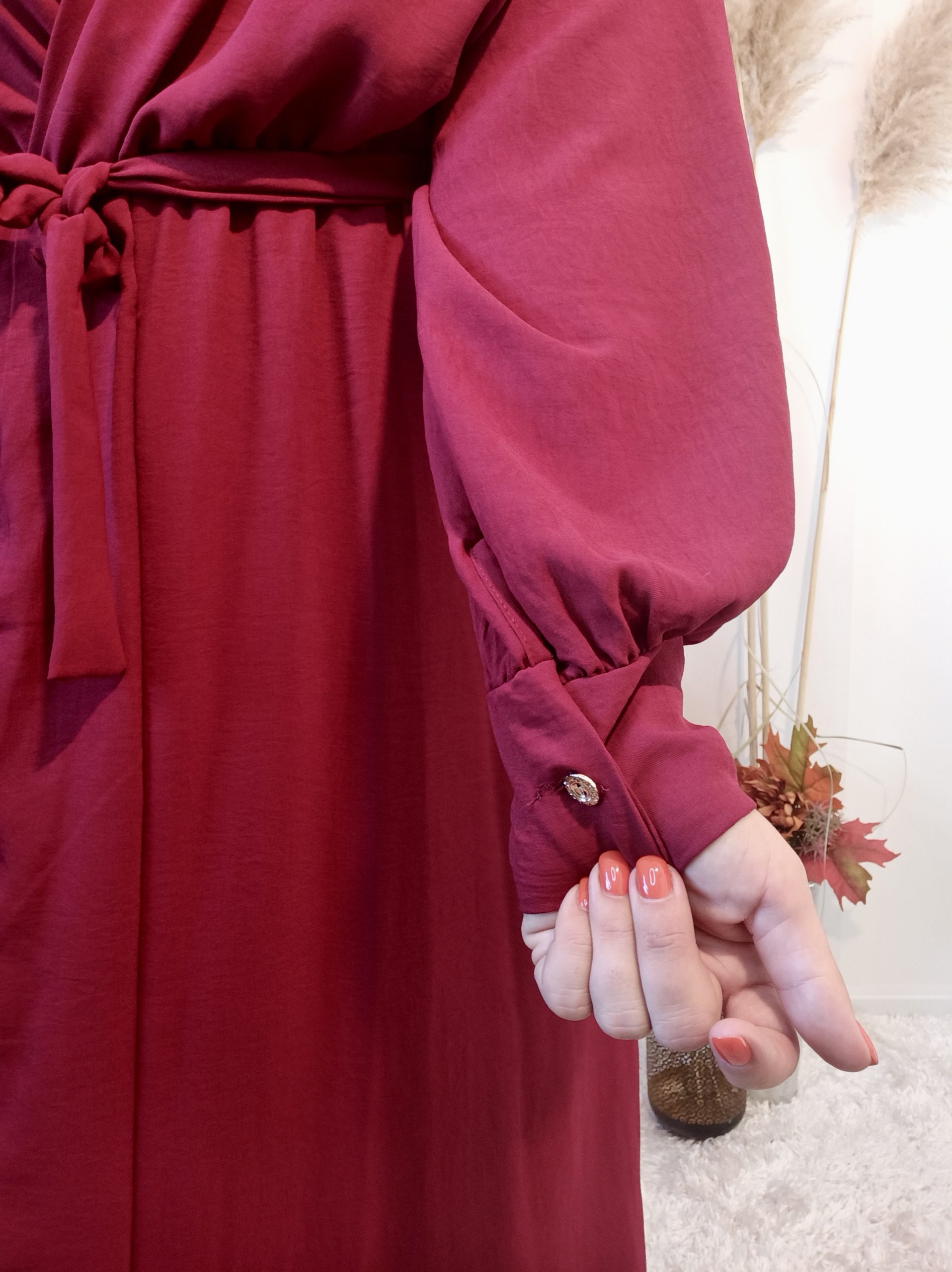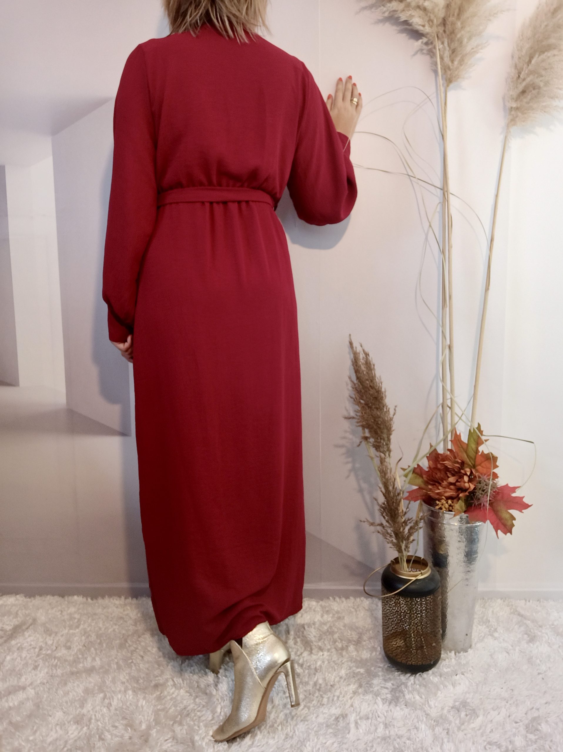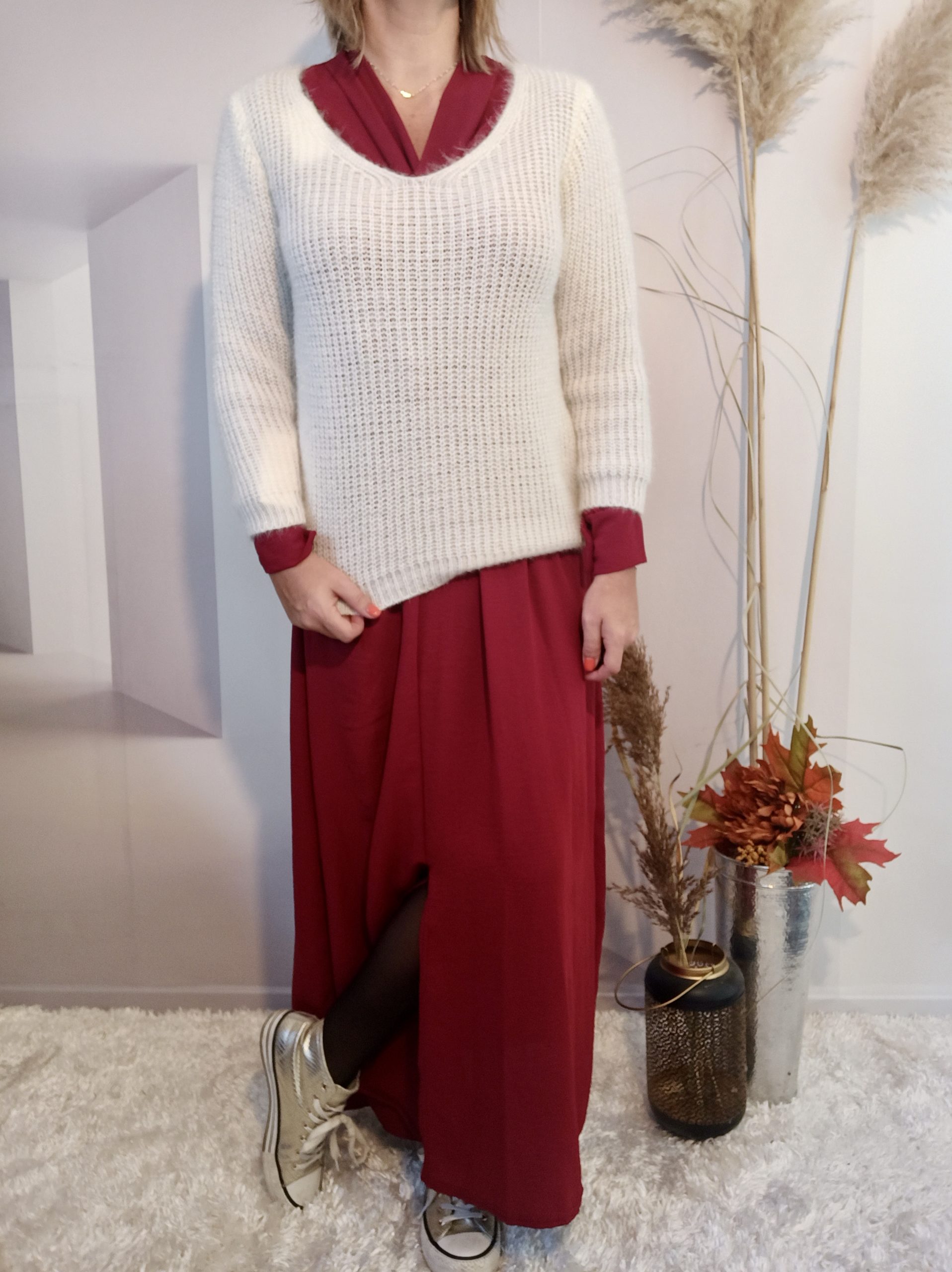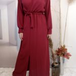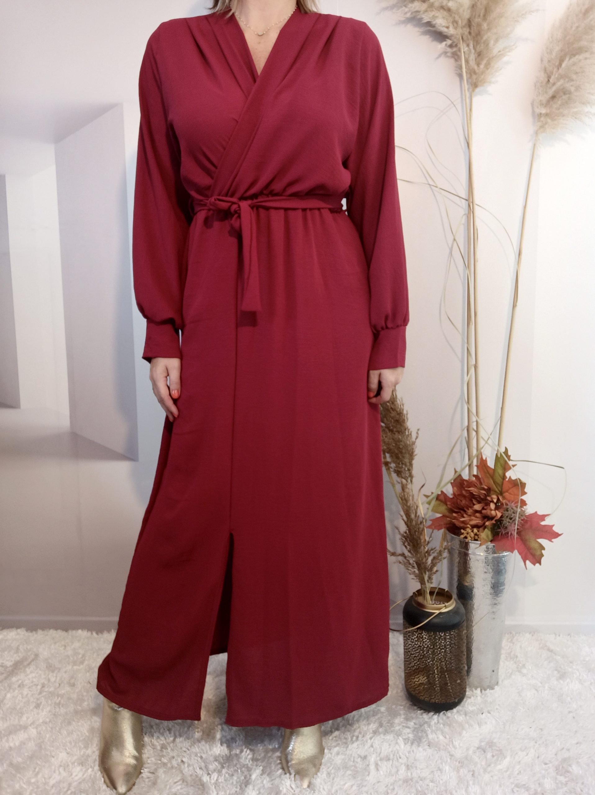 Robe fluide fendue niveau mollet à porter seule ou avec un pull ou une veste.