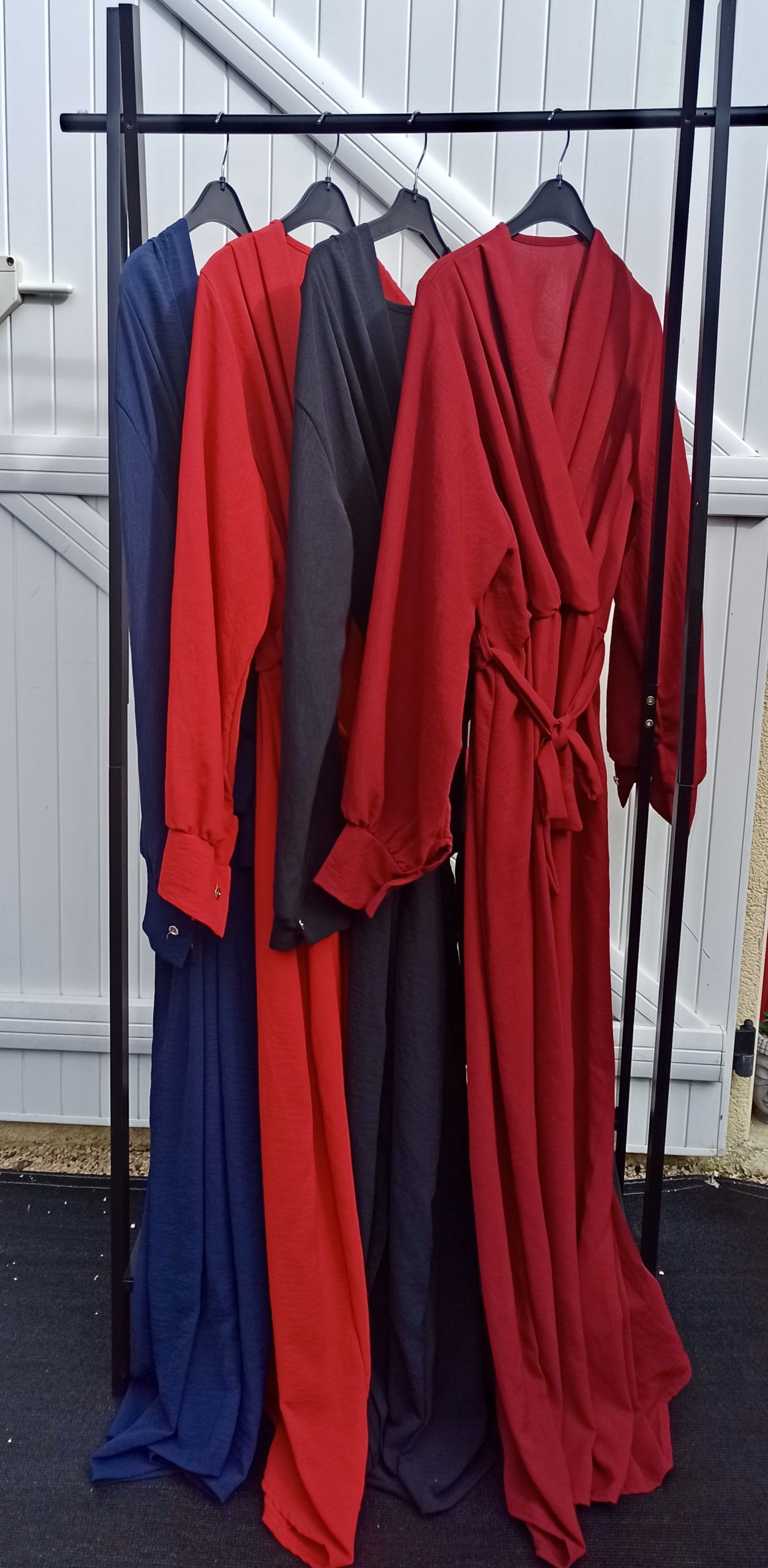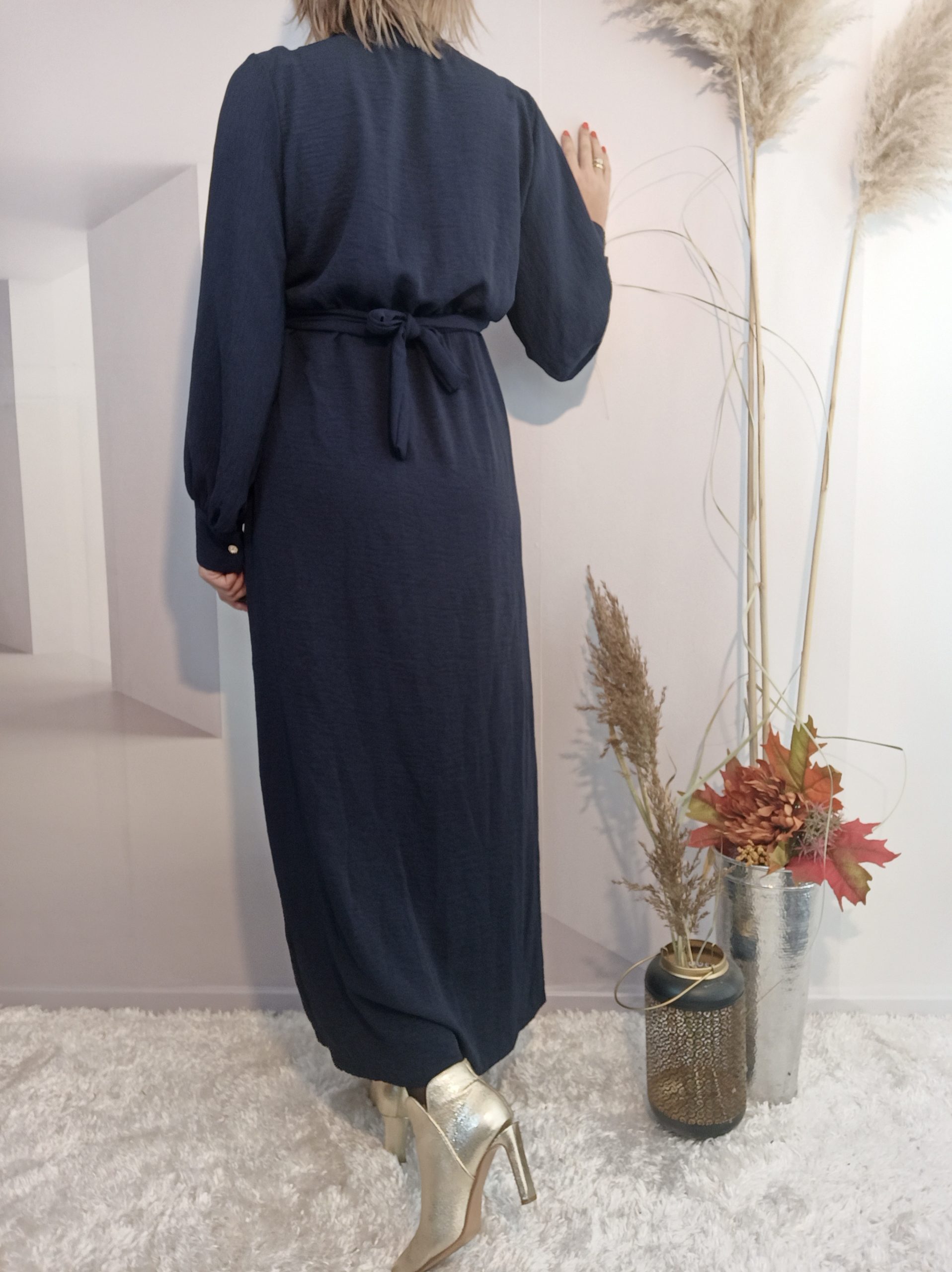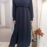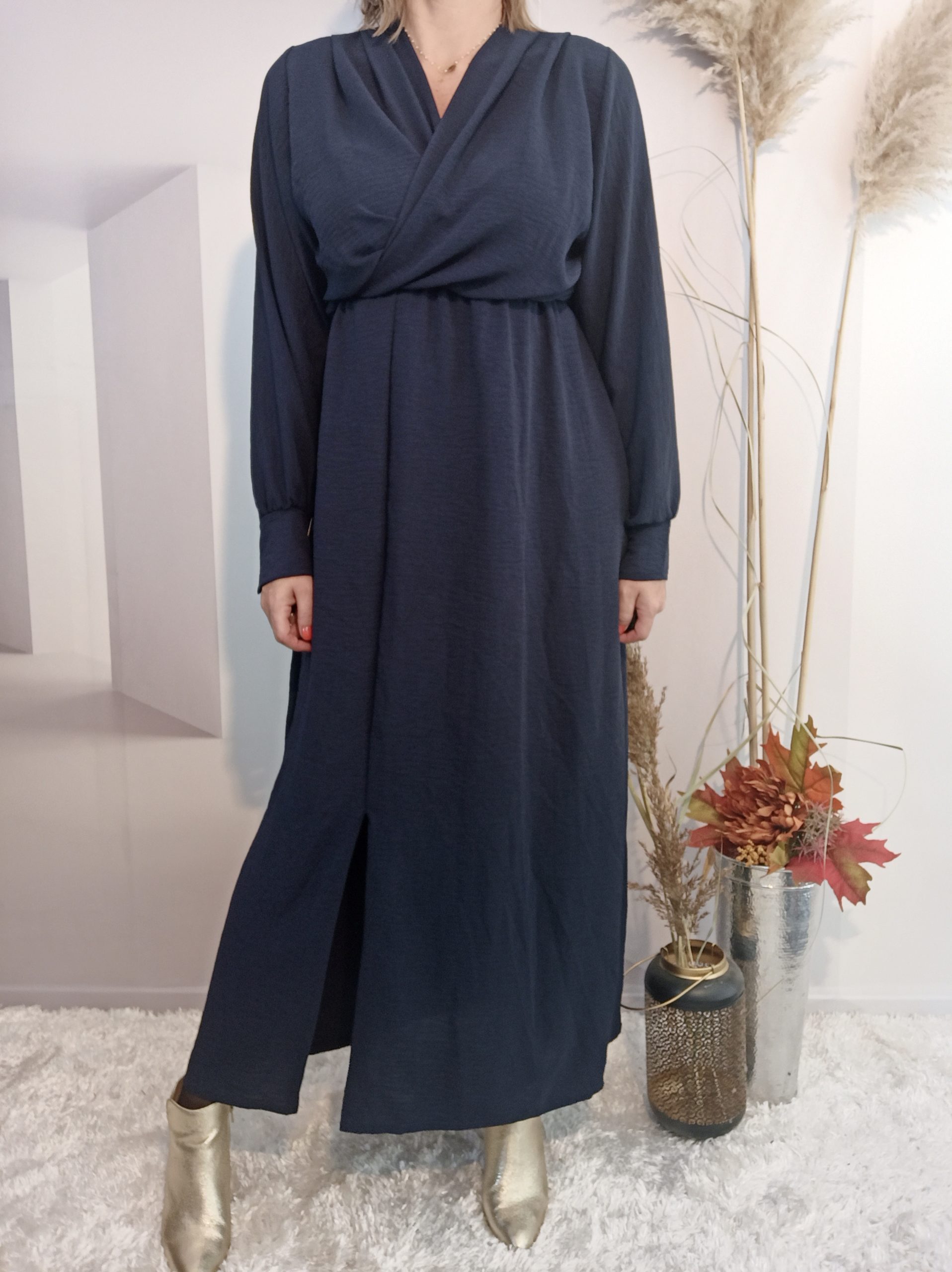 Robe fluide fendue niveau mollet à porter seule ou avec un pull ou une veste.