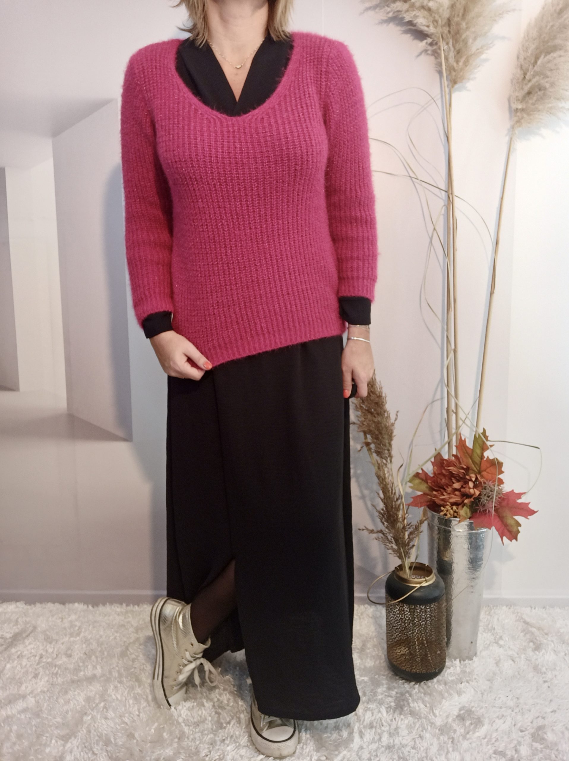 Robe fluide fendue niveau mollet à porter seule ou avec un pull ou une veste.