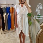 Robe asymétrique fluide à volants, nouée à la taille ce qui vous permet de l’ajuster en fonction de votre morphologie.