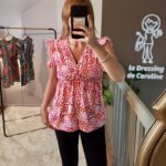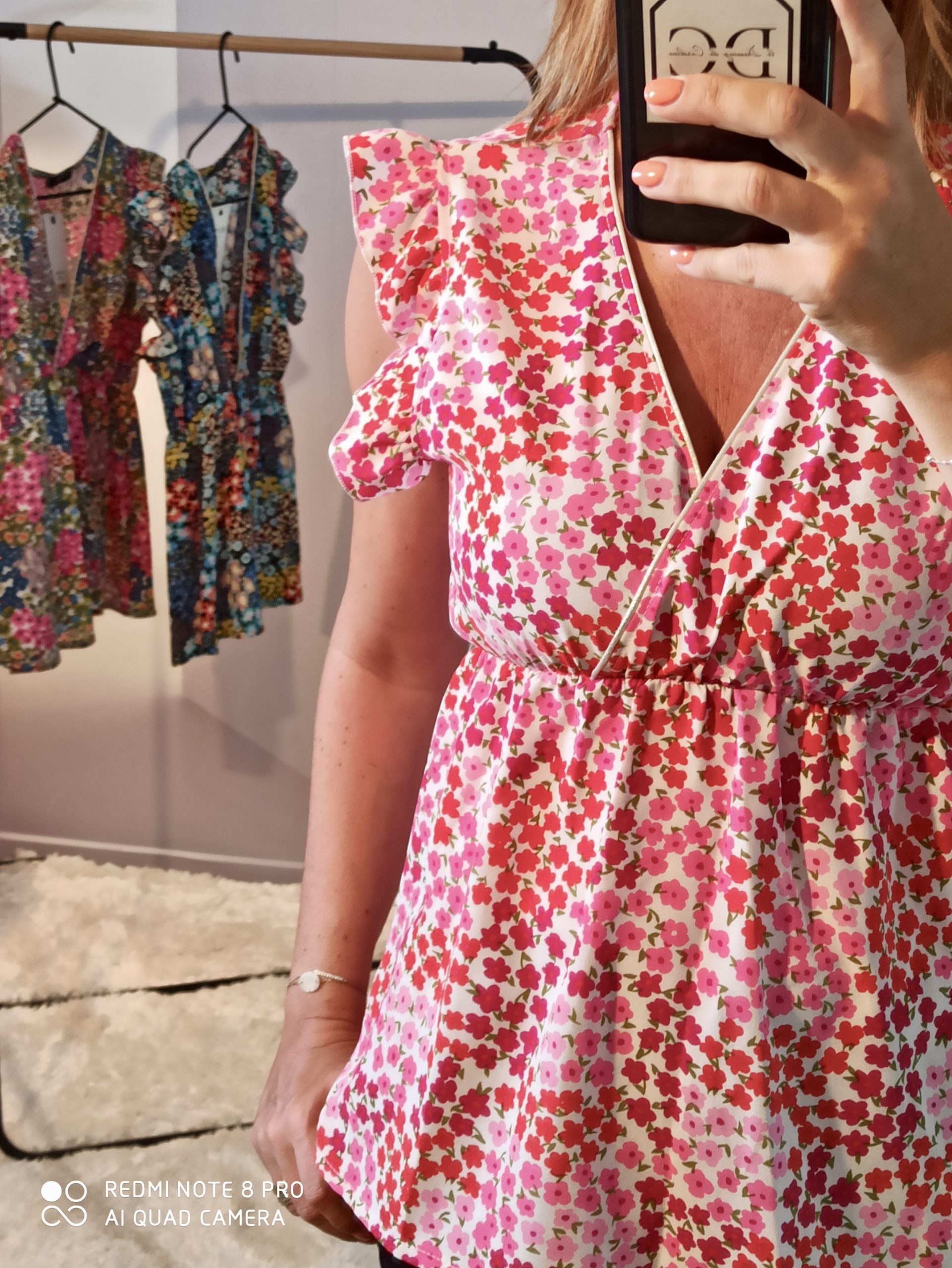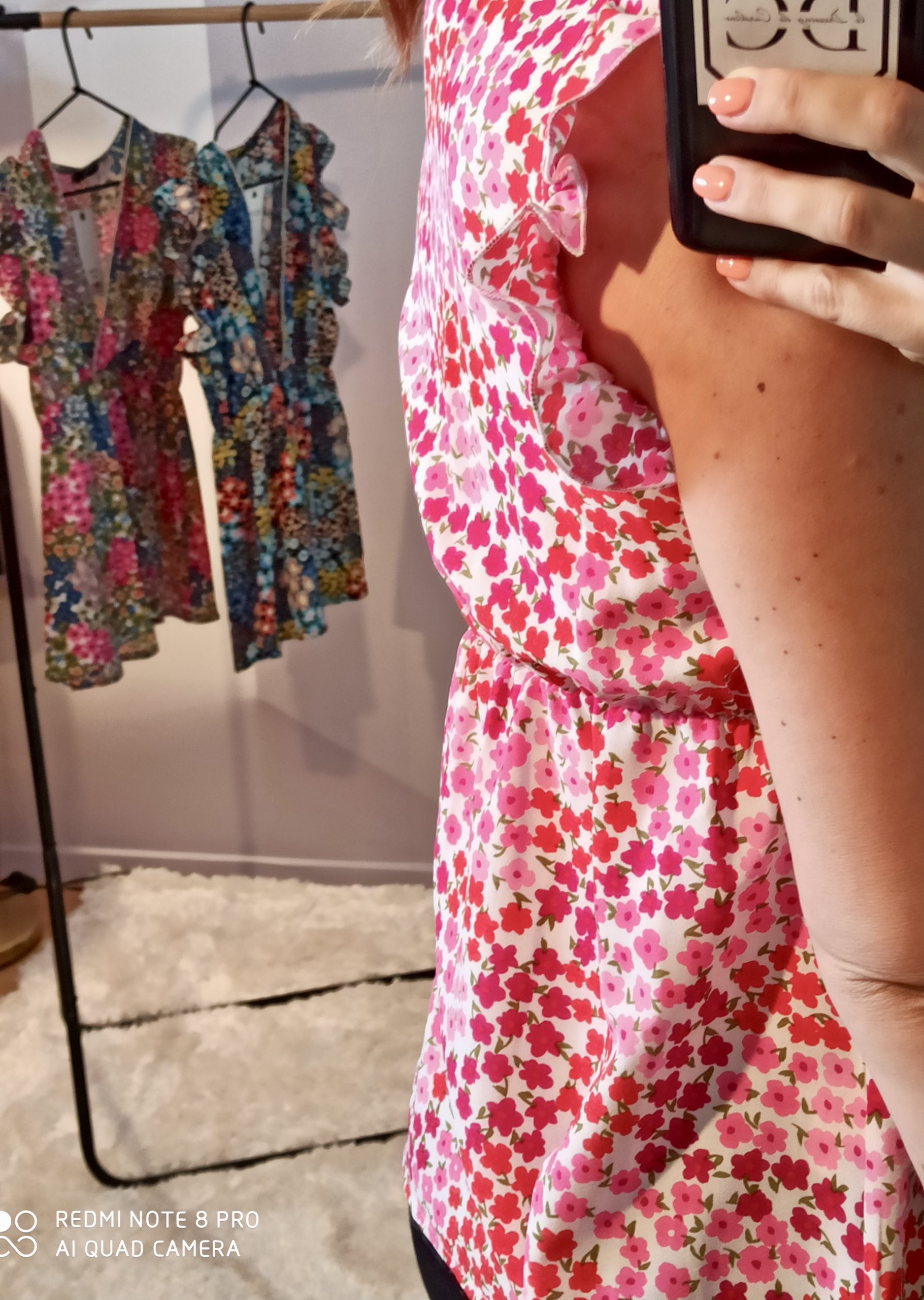 Top col cache-coeur avec volants aux manches et liseré à light gold à l’encolure.