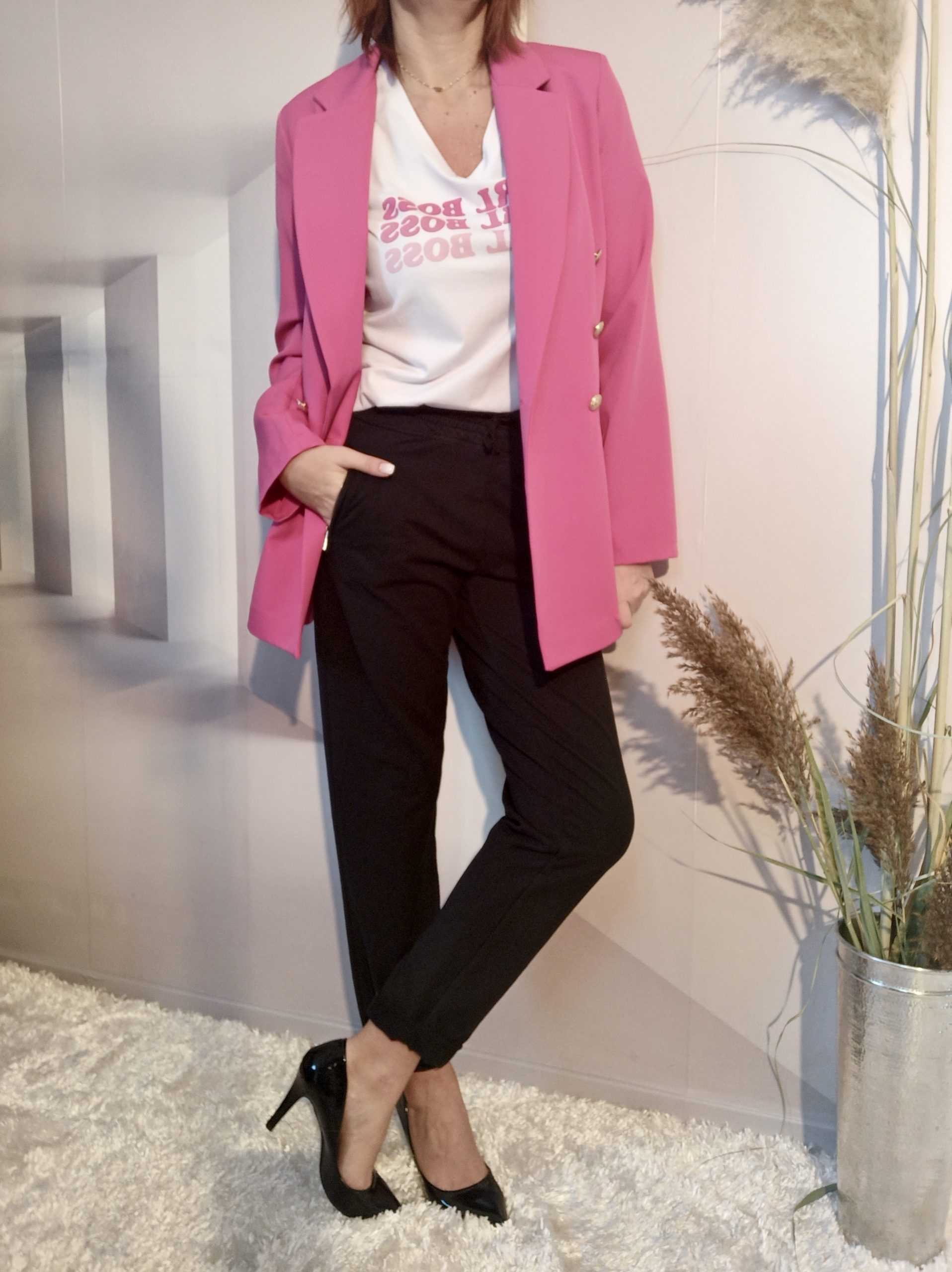 Porté avec le Pantalon Jog Noir et la Veste Officier Tailleur Rose